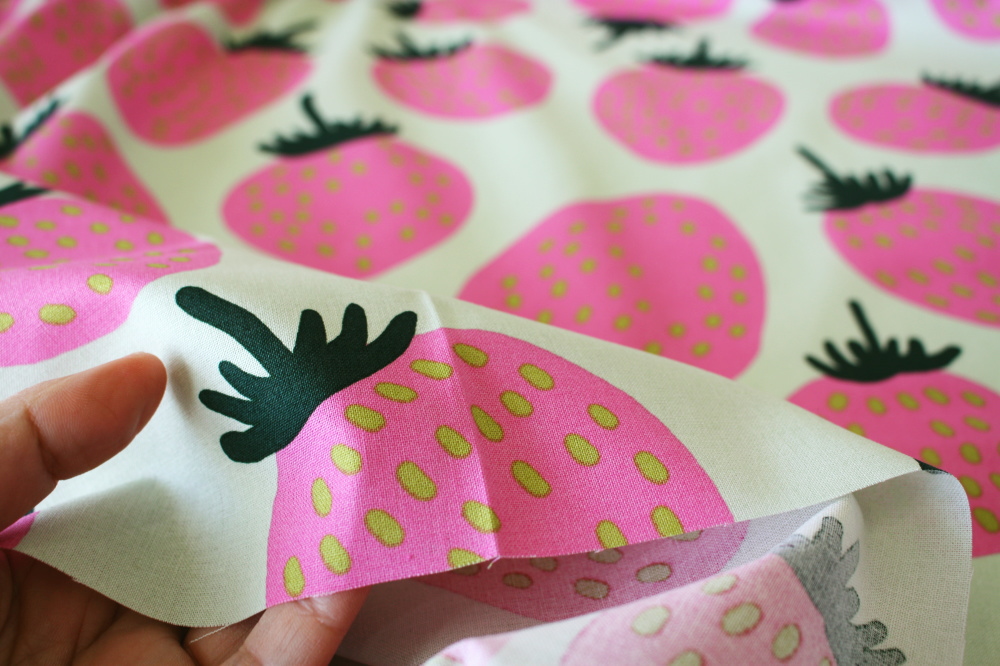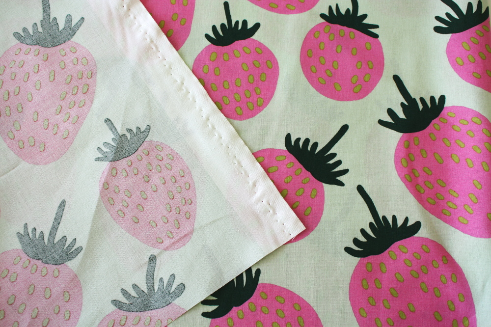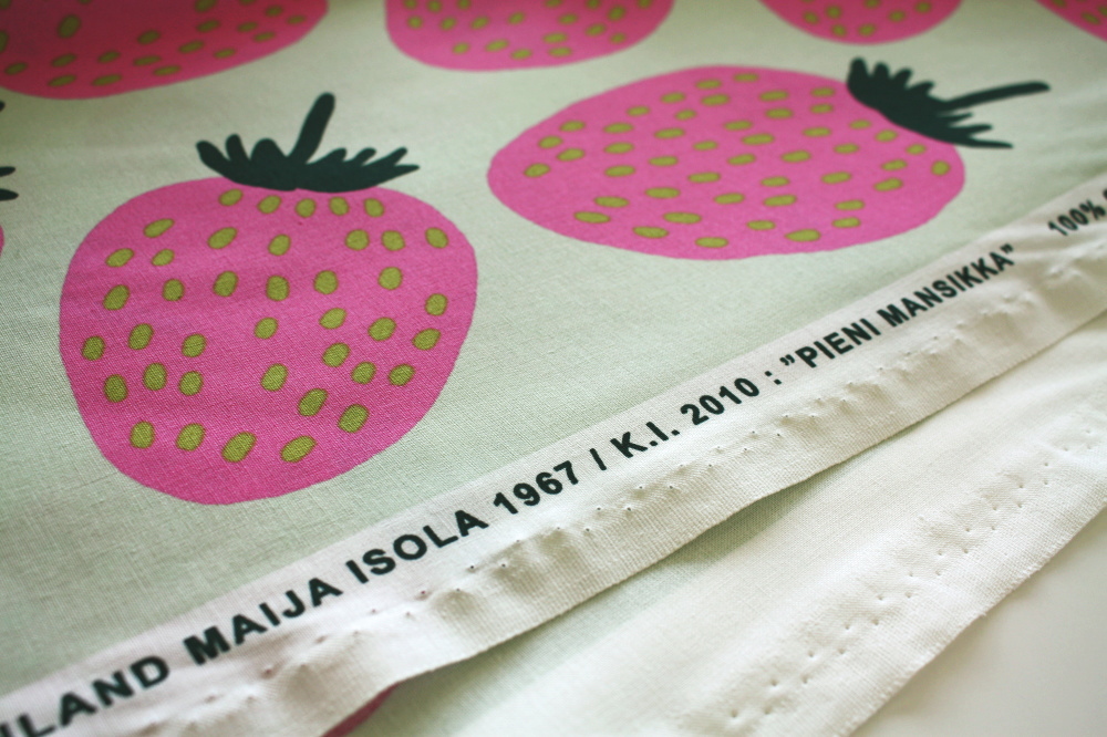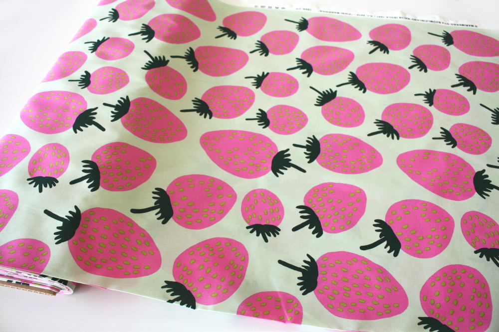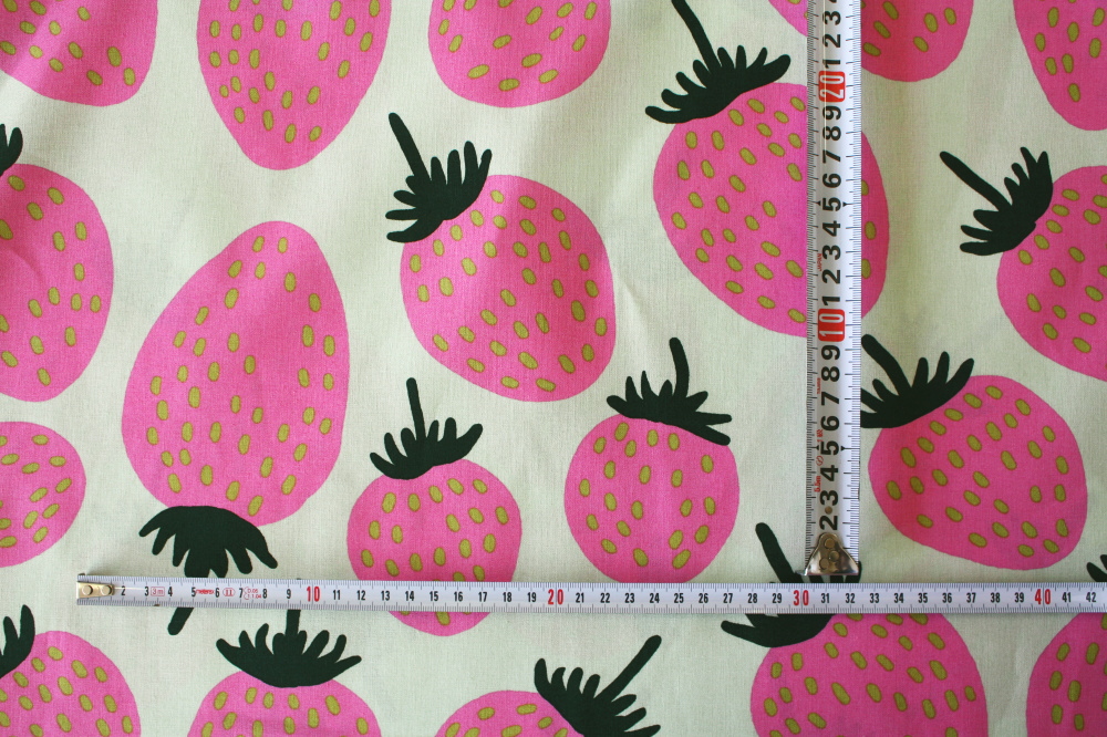 マリメッコのいちご柄生地入荷しました!淡いグリーン地にピンクの色合いがとっても可愛いです。マイヤ&クリスティーナ・イソラデザイン。