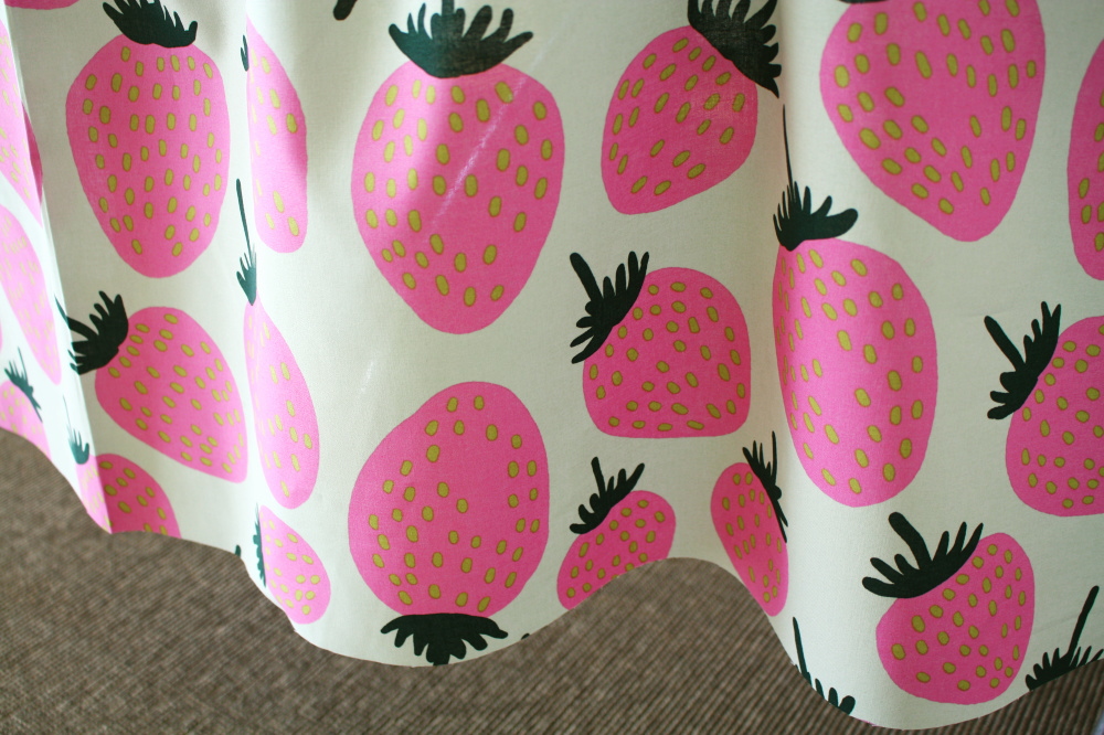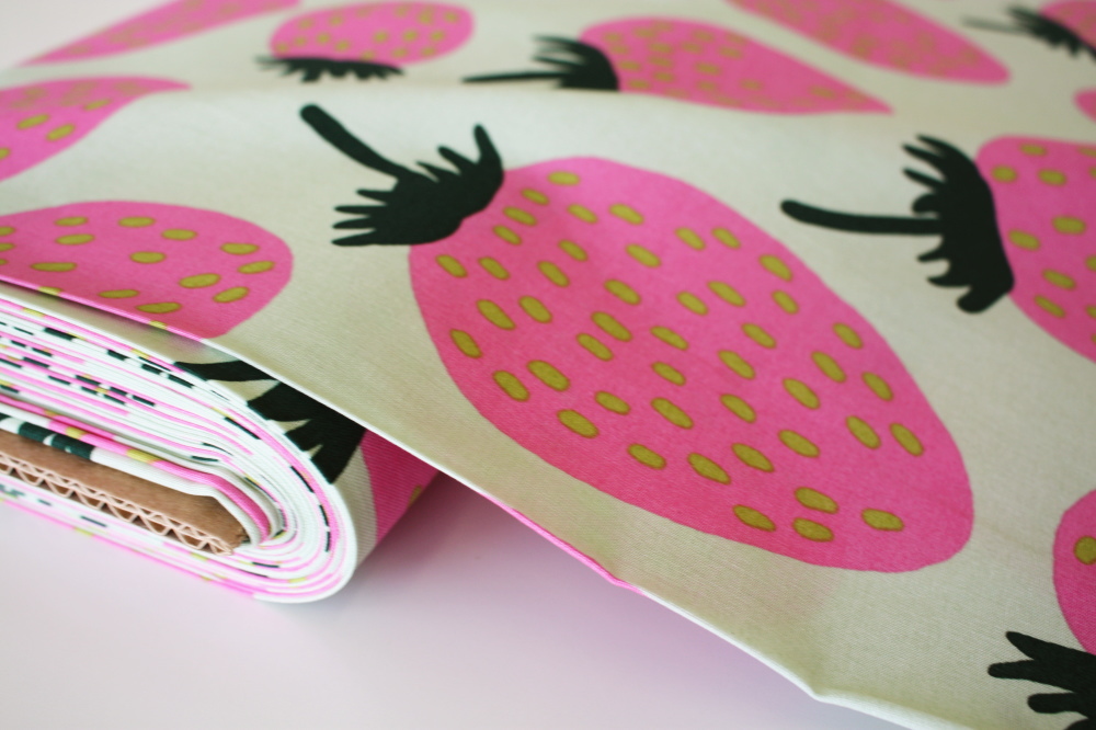 マリメッコのいちご柄生地入荷しました!甘めのピンクの色合いがとっても可愛いです。いちご柄は1967年にウニッコのデザイナーでもあるマイヤイソラによってデザインされました。生地色は淡く明るいグリーンです。いちごの葉っぱは濃い目の緑で、種部分は明るい黄緑色です。バランスのよい配色&カラーリングです。可愛いデザインですので、お子さんのお部屋のカーテンやシェードスタイル、アクセントのクッションなどにもおすすめです。