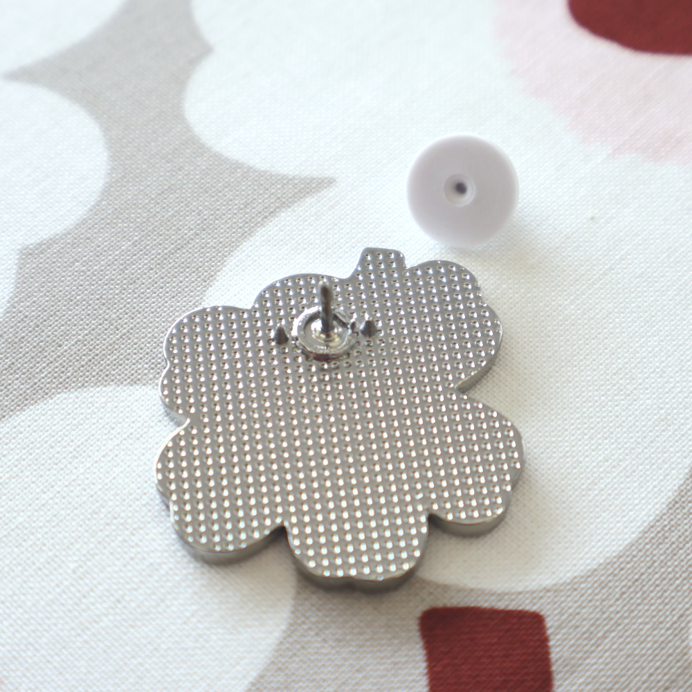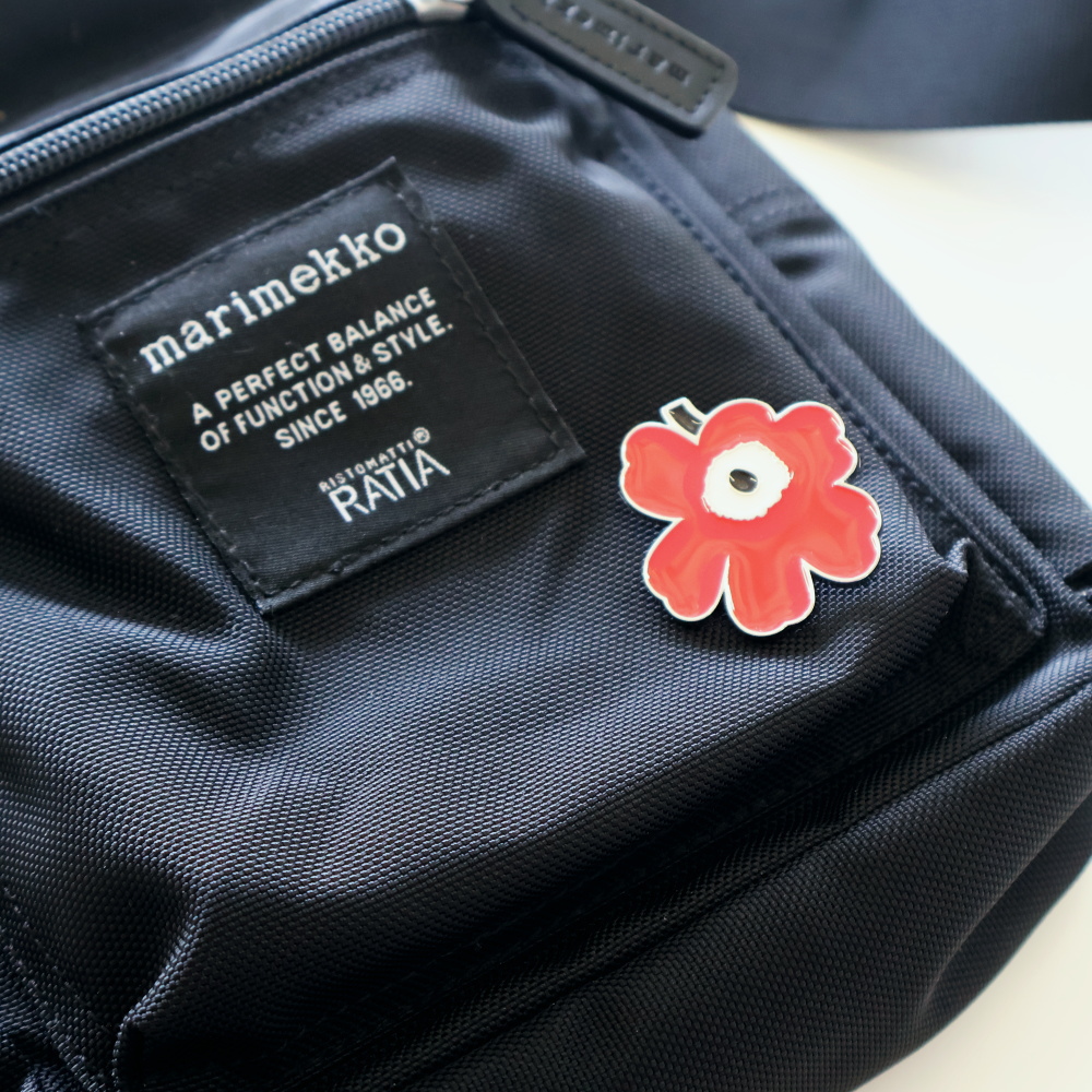 「UNIKKO(ウニッコ)」のお花柄がピンバッチになりました。すこし大きめですので、存在感もあります。バッグや帽子、ジャケットなどのアクセントとしてお使いいただけます。こちらは単品(ばら売り)での販売です。