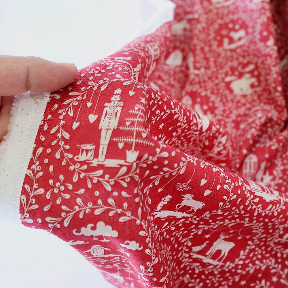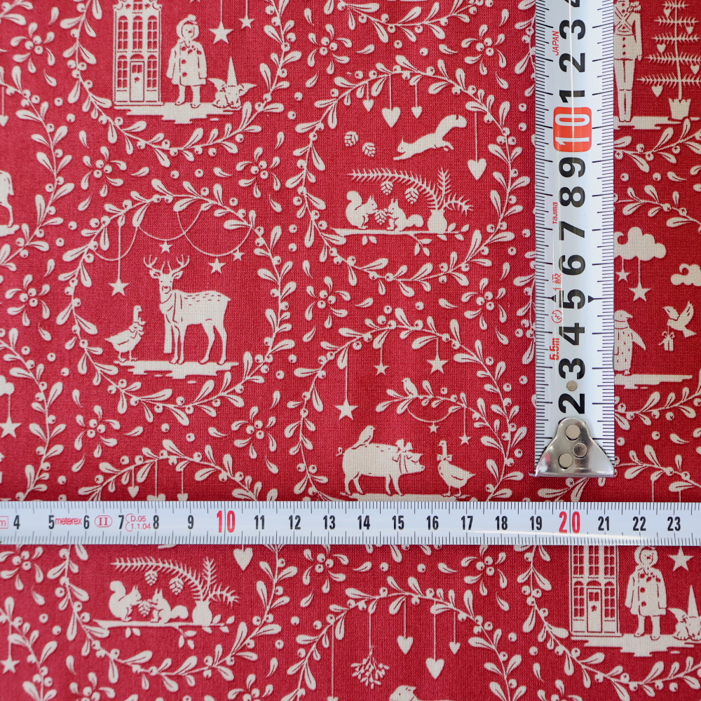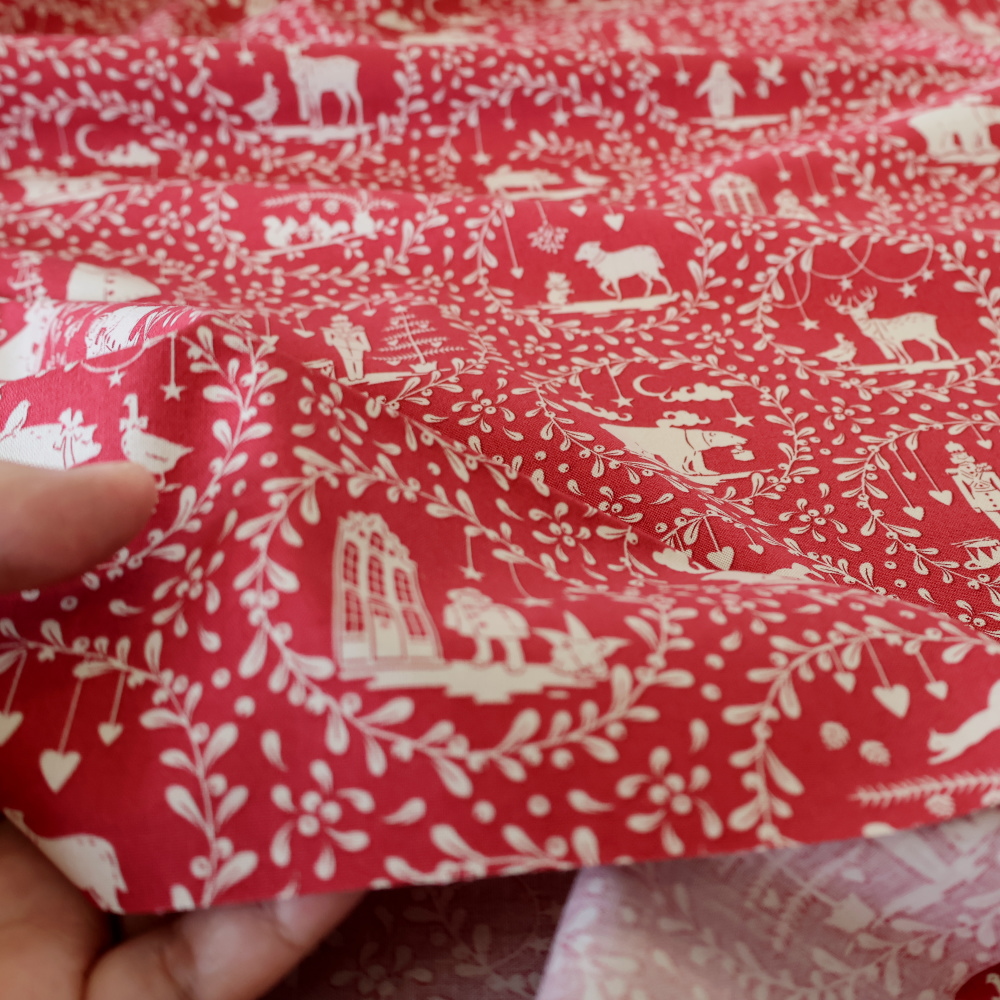 赤い地に白のモチーフがくっきりと映えて、まさにクリスマスシーズンにぴったりの生地です。くるみ割り人形やサンタ、北欧の動物たちが一面に描かれているので、眺めているだけで物語の世界に入ったような気分に。テーブルランナーやツリー用スカート、クッションカバーに仕立てればお部屋が一気にホリデームードに変わります。初心者さんにも扱いやすい厚みなので、今年の冬はぜひ手作りを楽しんでみてください。