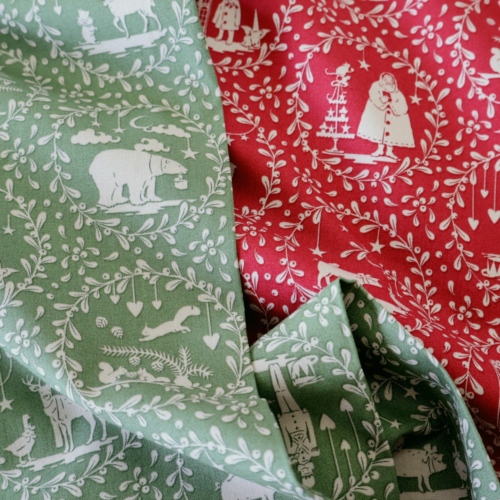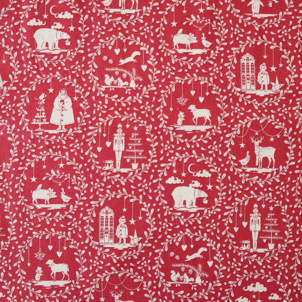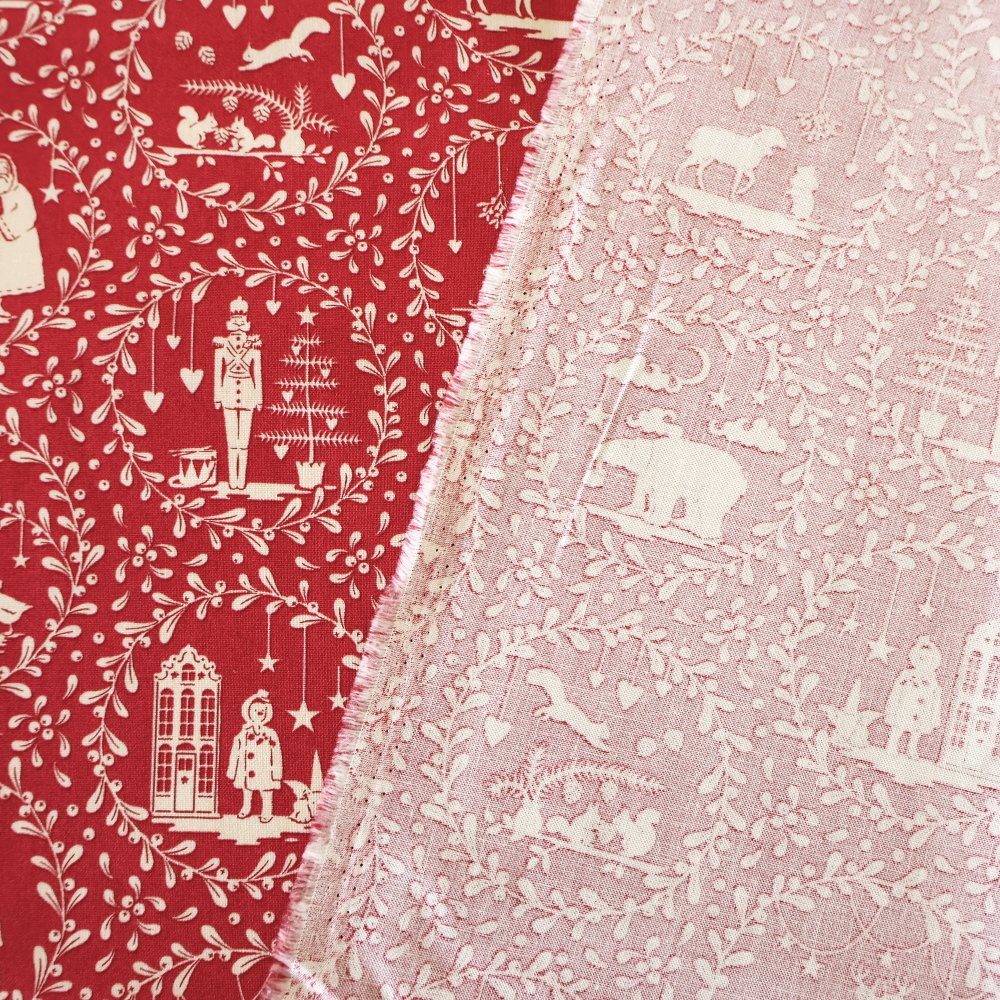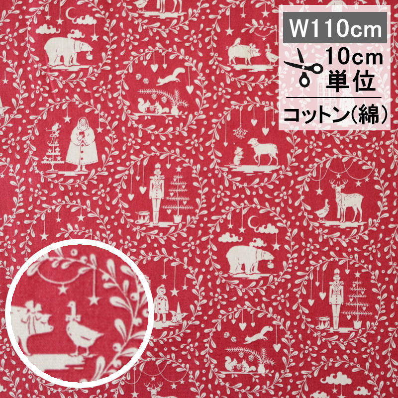 赤い地に白のモチーフがくっきりと映えて、まさにクリスマスシーズンにぴったりの生地です。くるみ割り人形やサンタ、北欧の動物たちが一面に描かれているので、眺めているだけで物語の世界に入ったような気分に。テーブルランナーやツリー用スカート、クッションカバーに仕立てればお部屋が一気にホリデームードに変わります。初心者さんにも扱いやすい厚みなので、今年の冬はぜひ手作りを楽しんでみてください。