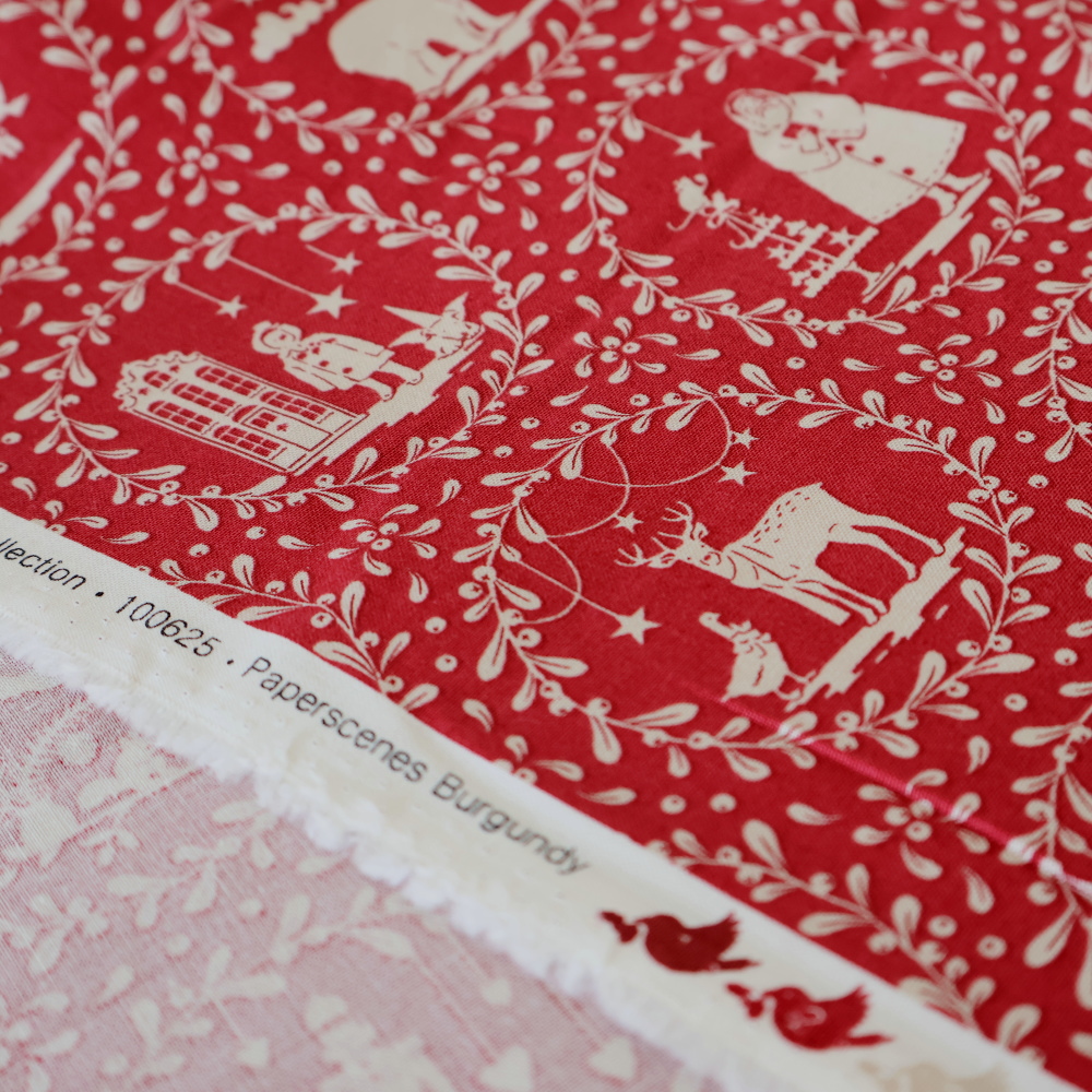 ノルウェー発「Tilda」2025年秋冬コレクションMERRY LITTLE CHRISTMASの柄「Paperscenes Burgundy」。深いバーガンディの地色に、リースの中に描かれた冬の情景が映える、クリスマスらしい華やかな生地です。