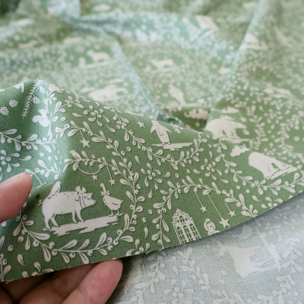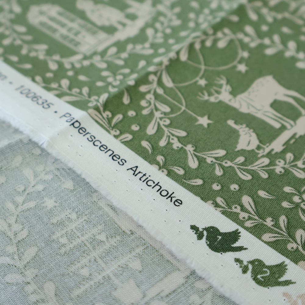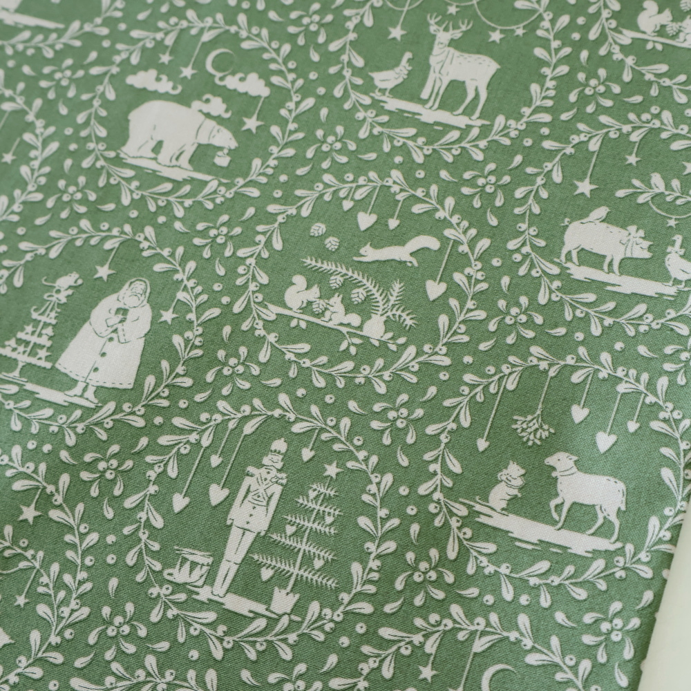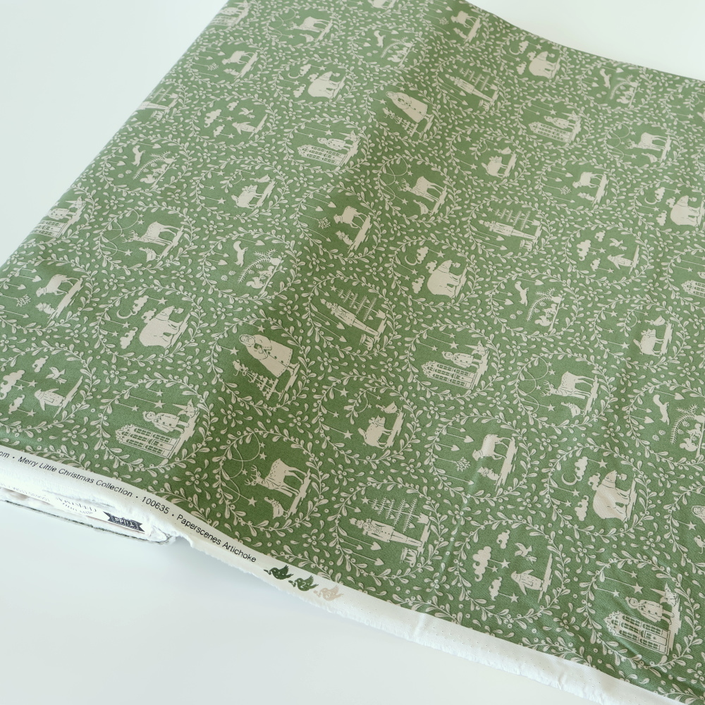 MERRY LITTLE CHRISTMASから、「Paperscenes Artichoke」。落ち着いたグリーンに淡色のモチーフが映える、クラシカルな北欧クリスマス柄。リースの中にサンタや動物、街並みが描かれ、パネルや小物、冬のカーテンにもぴったりです。