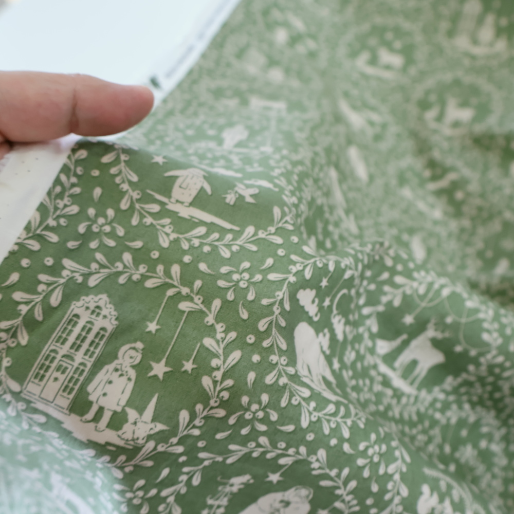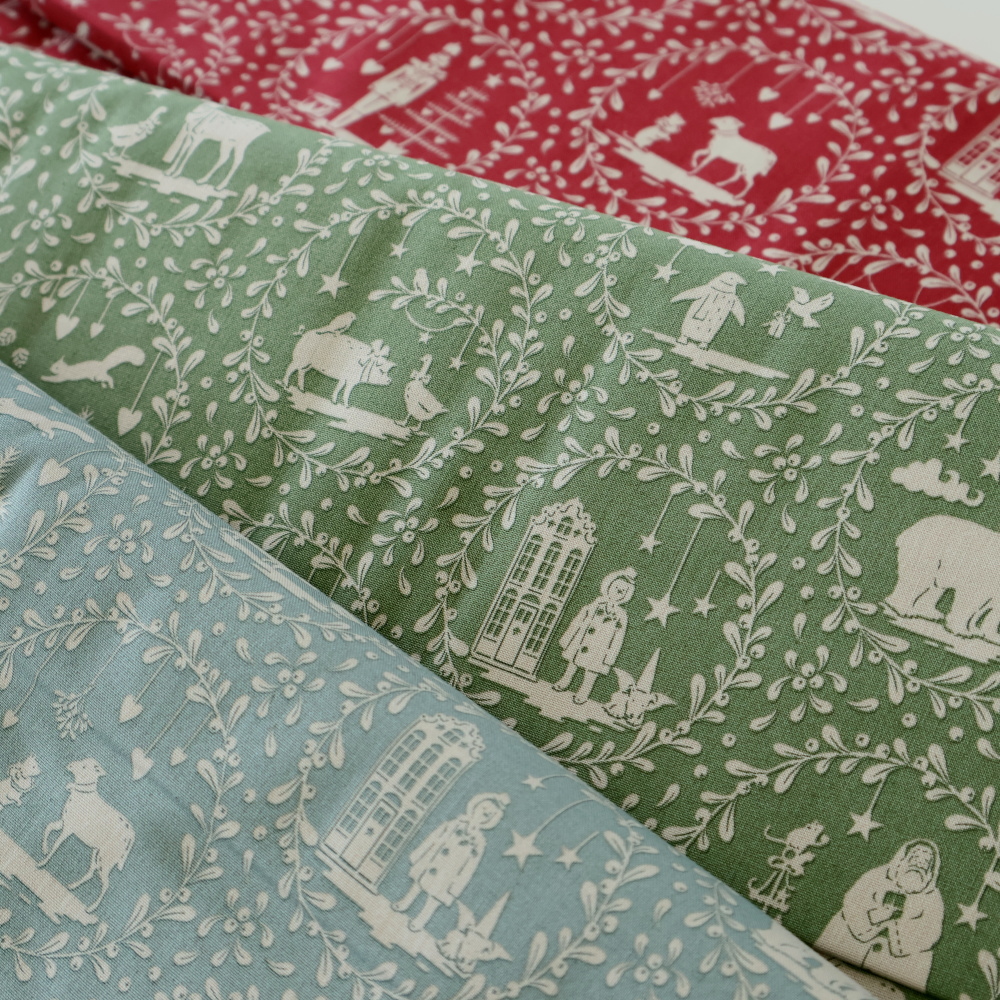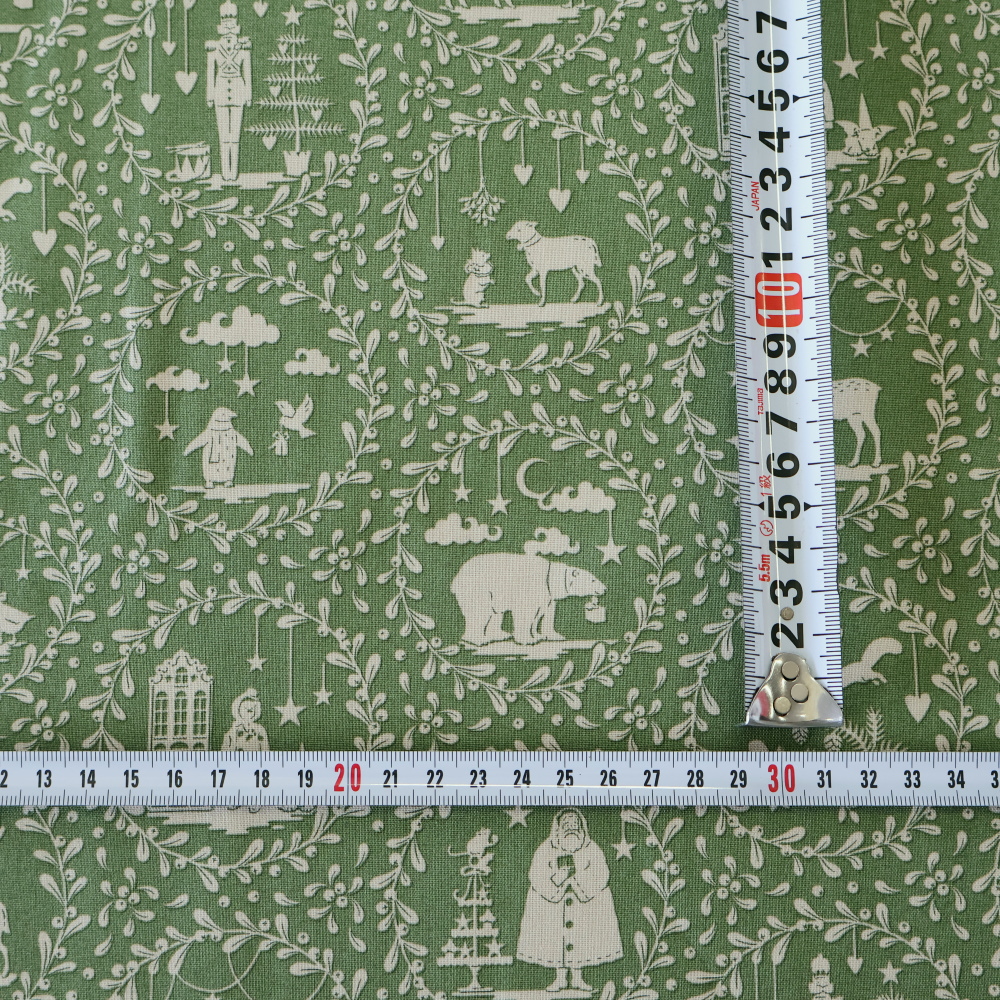 深いグリーンが空間に落ち着きをもたらしてくれます。冬のクッションカバーやタペストリー、ギフト用の巾着にしても素敵。飽きのこないクラシカルな色合いなので、毎年のクリスマスに出して楽しめる生地です。