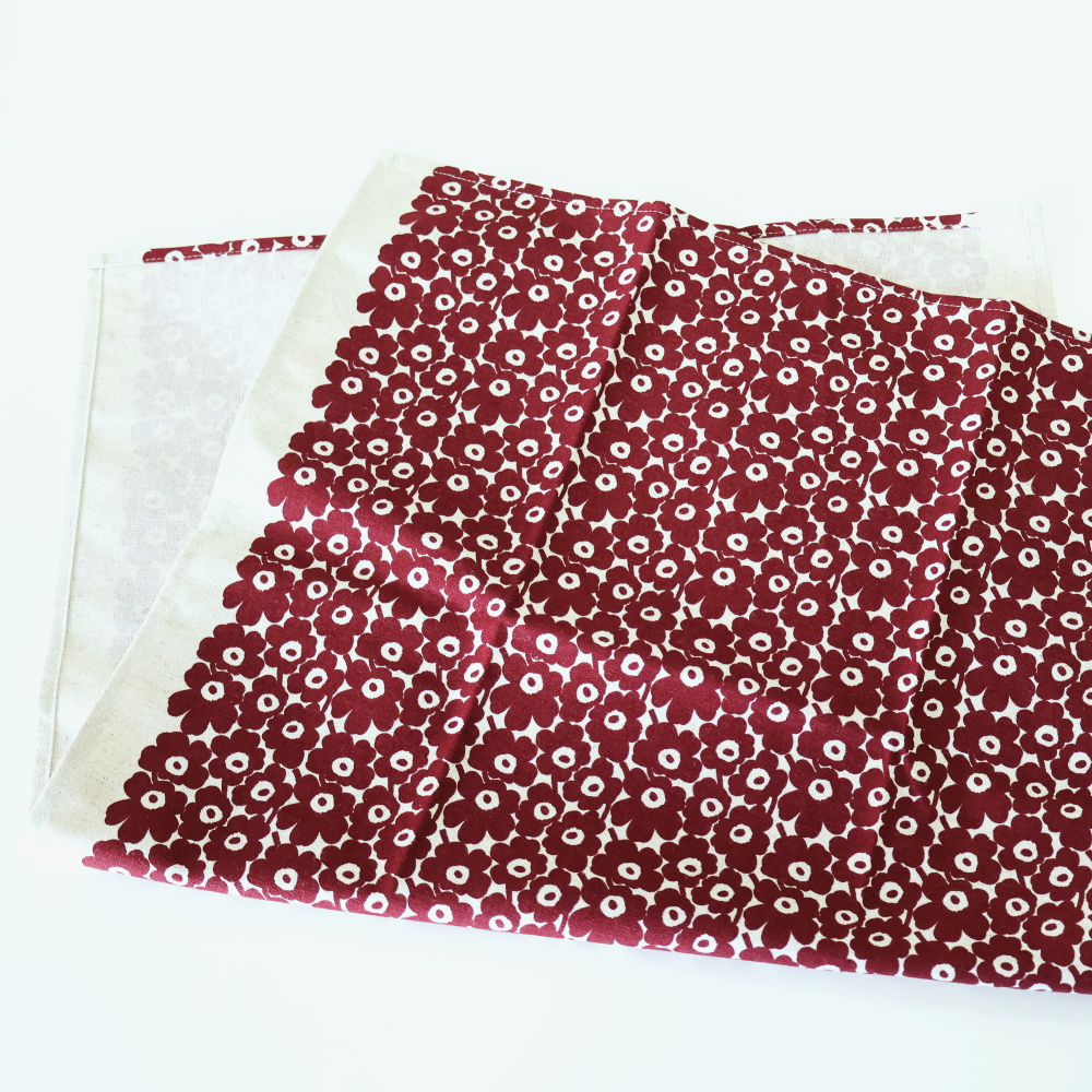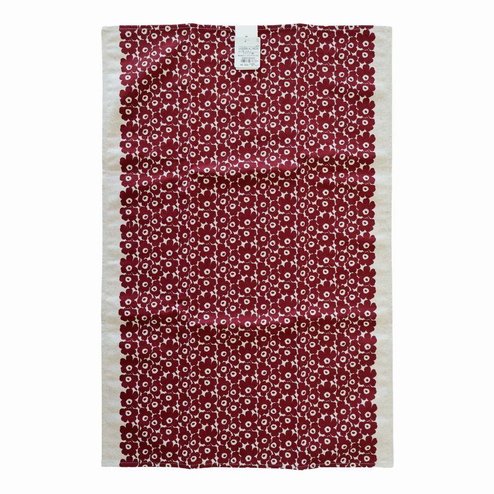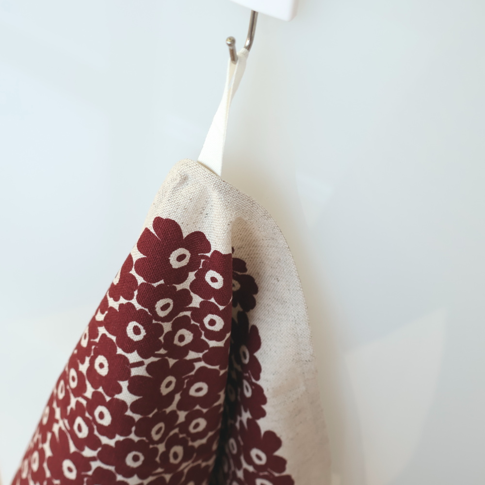 ピックイネンウニッコの小花がぎっしりと咲いた、深みのあるワインレッドのキッチンタオル。 食器拭き・ランチョンマット・かごの目隠しなど、使い道は多彩で、毎日の台所仕事も快適にも。ギフトにもおすすめです。