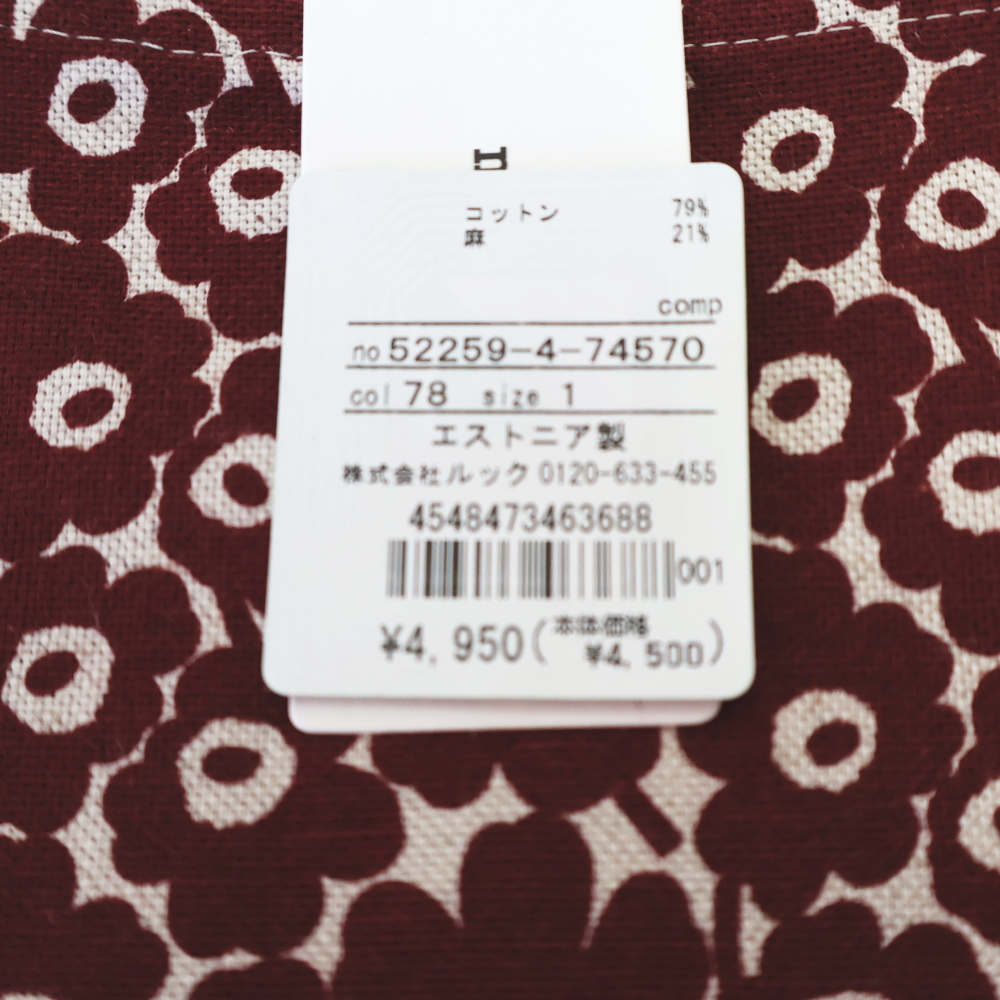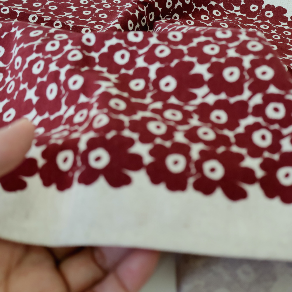 生成り地にボルドーの花々。落ち着いたトーンだから、和洋どちらの食器とも好相性。広げても畳んでも柄が途切れず、使うほどに愛着が湧きます。