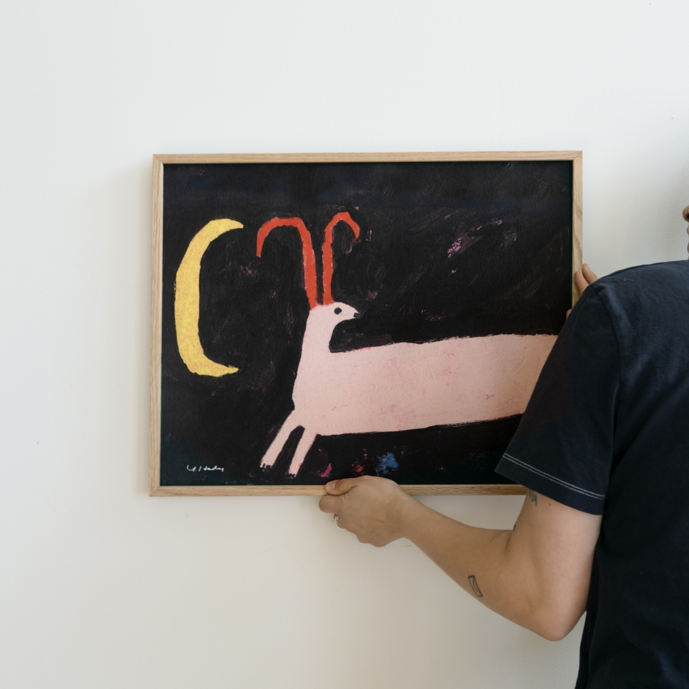黒い夜空に浮かぶ三日月と、赤い角をもつピンクの動物。はだよしこ(Yoshiko Hada)さんの描く「FANTASTIC NIGHT」は、夢と現実のあわいを漂うような幻想的な一枚です。シンプルな線と大胆な配色で、静けさの中に遊び心と物語性を感じさせます。