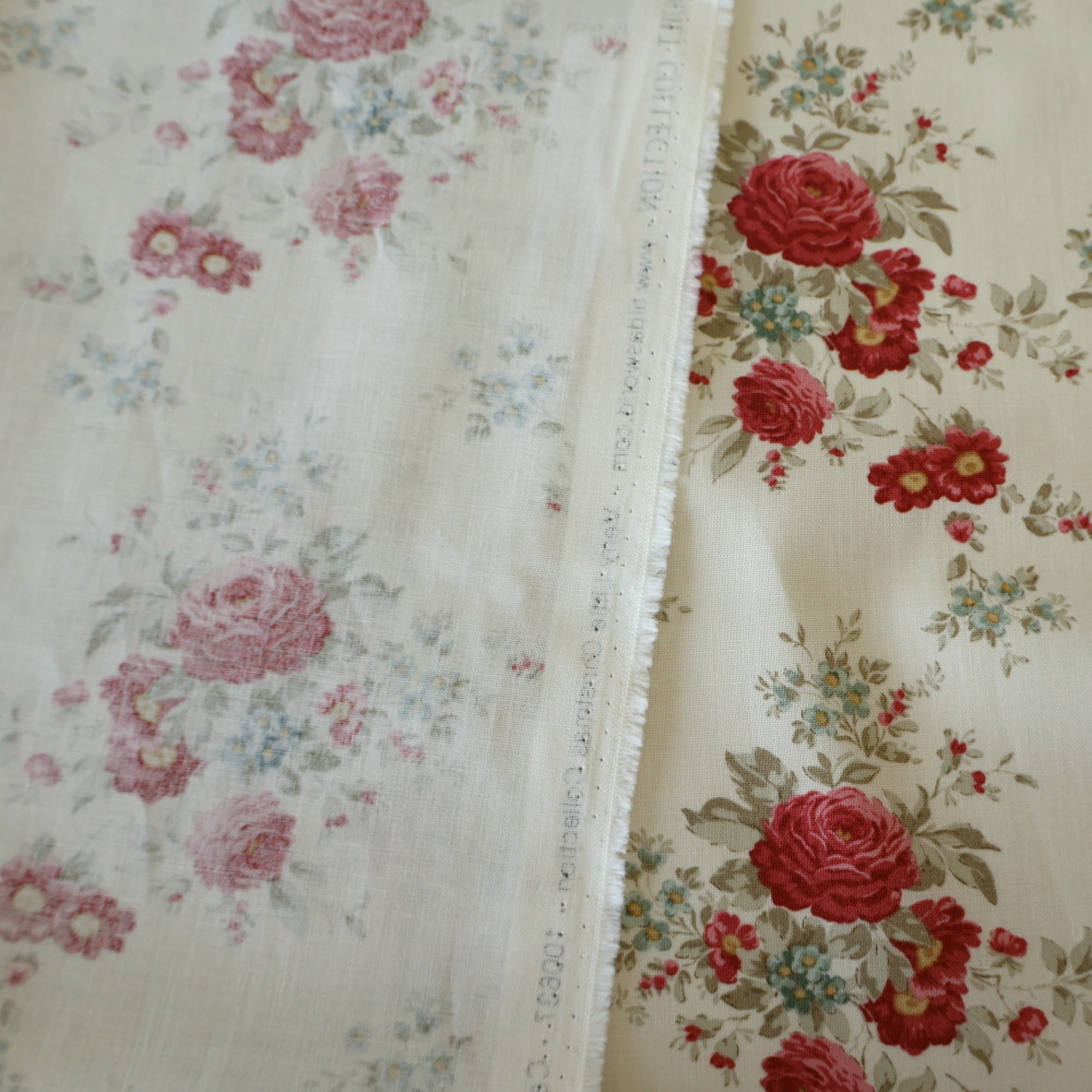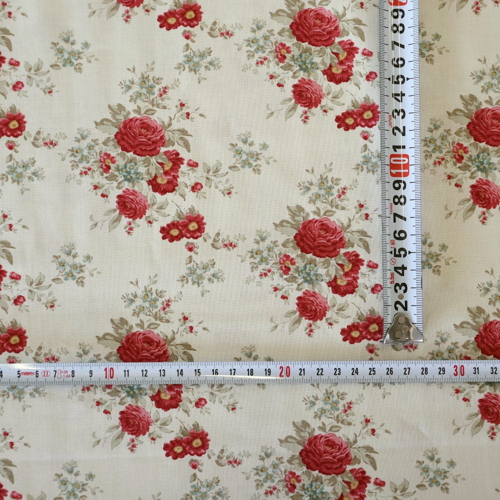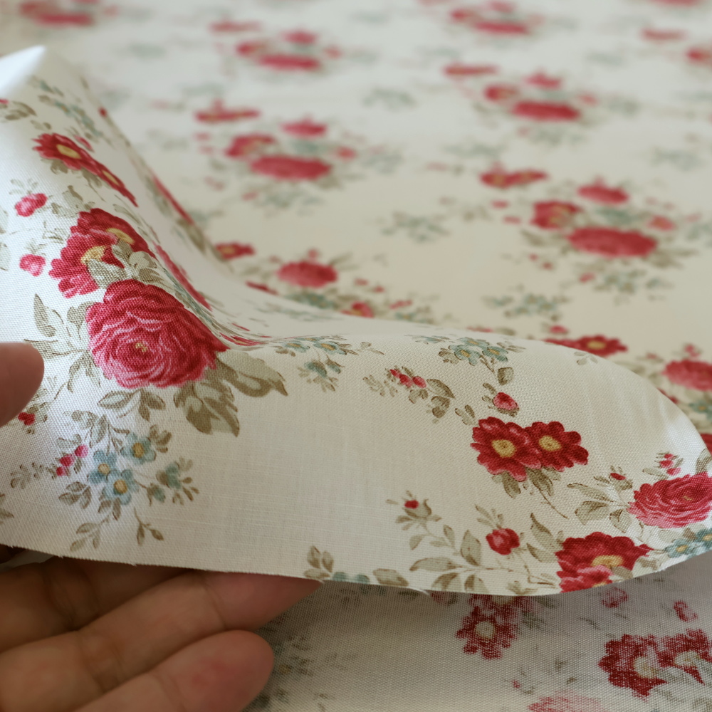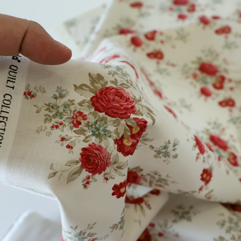 規則的に並ぶブーケがレイアウトしやすく、タペストリーやミニトート、ランチョンマットにも好相性。メイン使いでも、無地や小柄と合わせたパッチワークでも映えます。