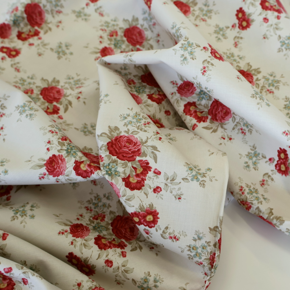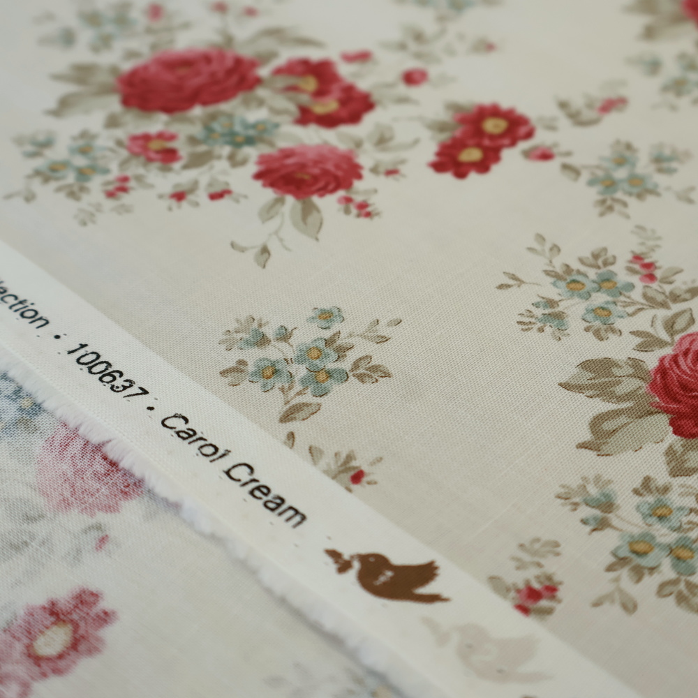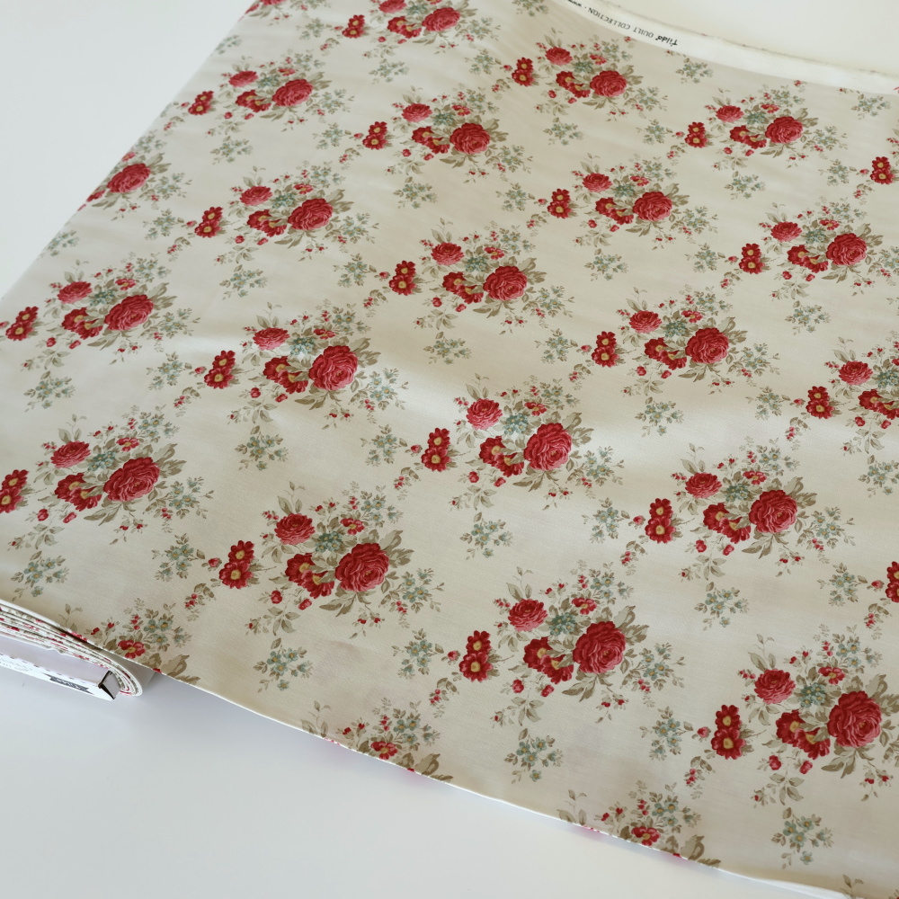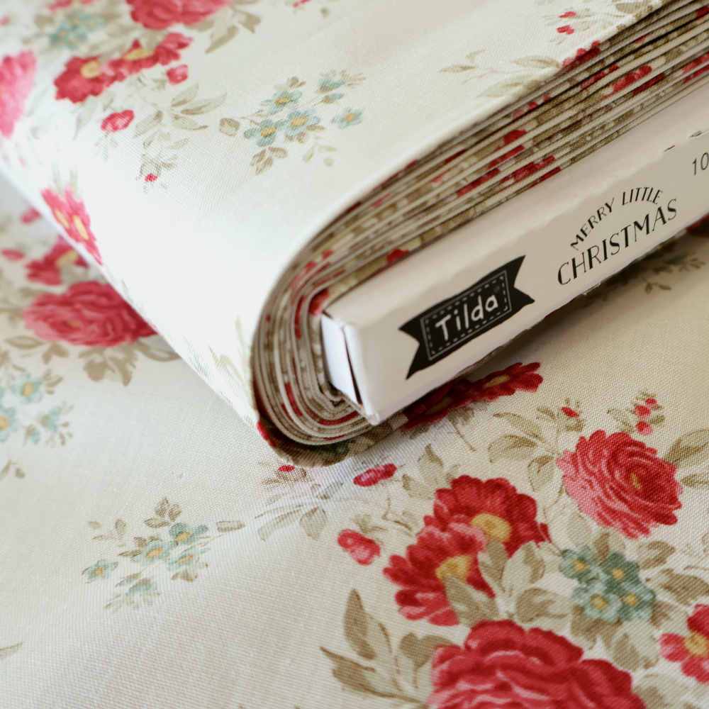 ノルウェー発「Tilda」より、2025年秋冬MERRY LITTLE CHRISTMASコレクションのフローラル柄Carol。クリーム地に、深いレッドのローズとセージグリーンのリーフ、小花のブルーが可憐に散るクラシカルなブーケプリントです。甘さはありつつも落ち着いたトーンで、季節を問わず使える上品な雰囲気に仕上がります。