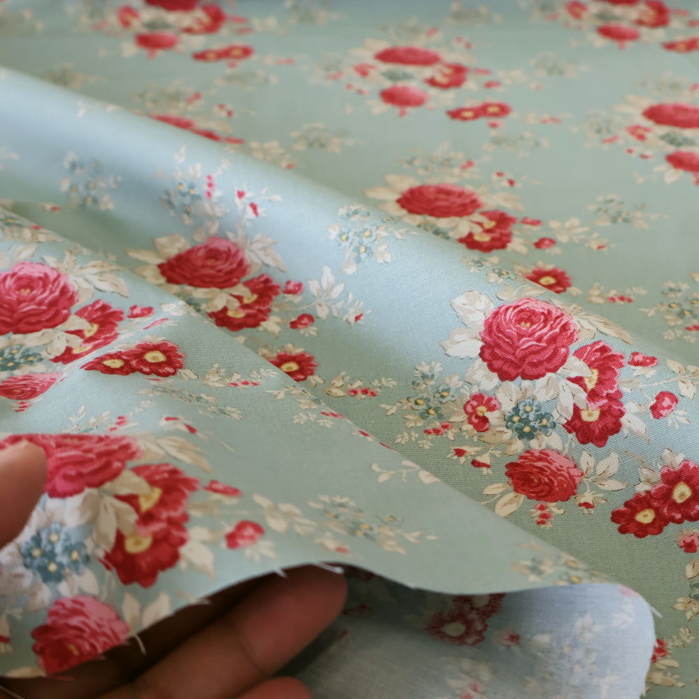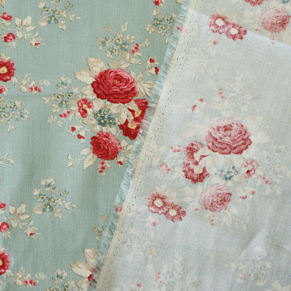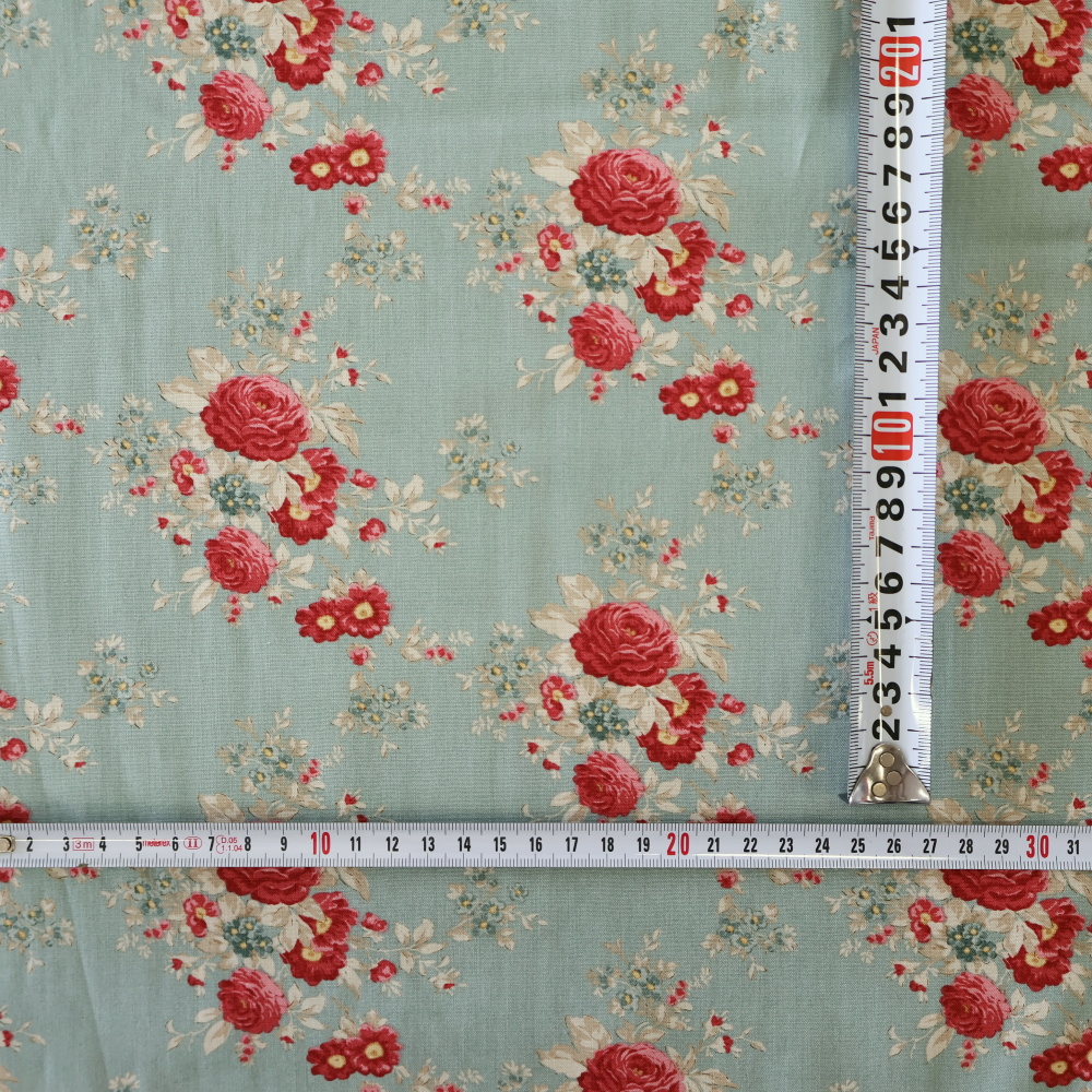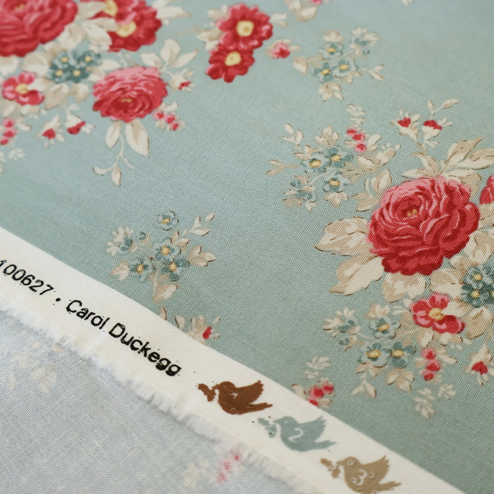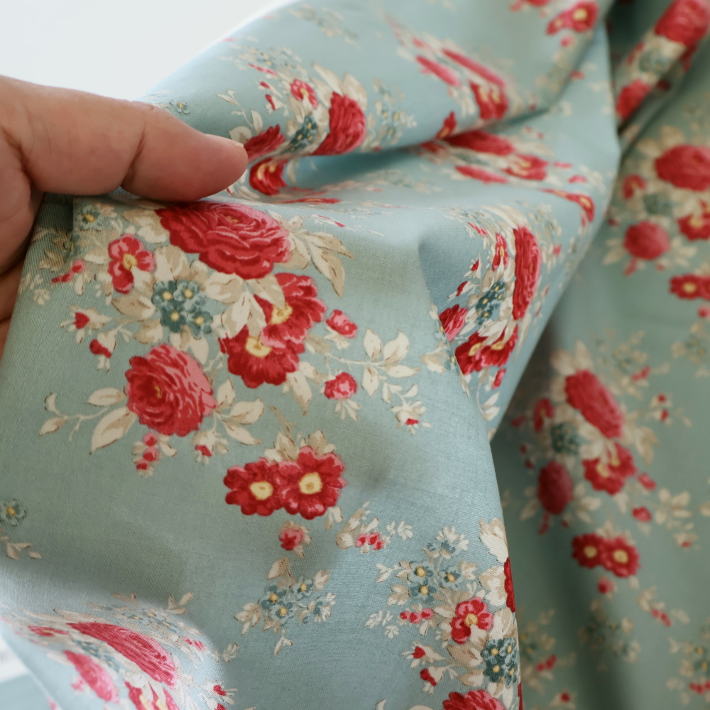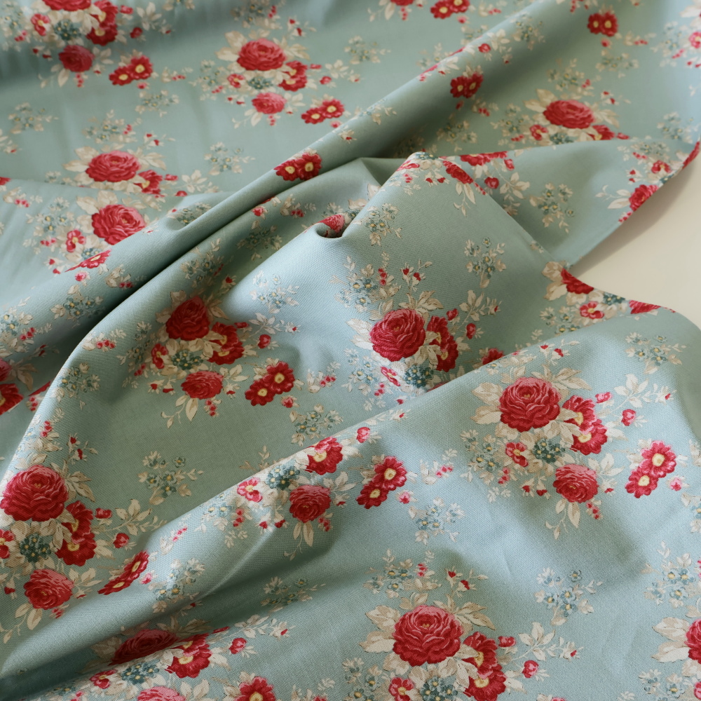 ダックエッグブルーの背景が明るい印象を与え、赤いローズをより際立たせます。キッチン小物やトートバッグ、パッチワークキルトにもおすすめの上品な一枚です。