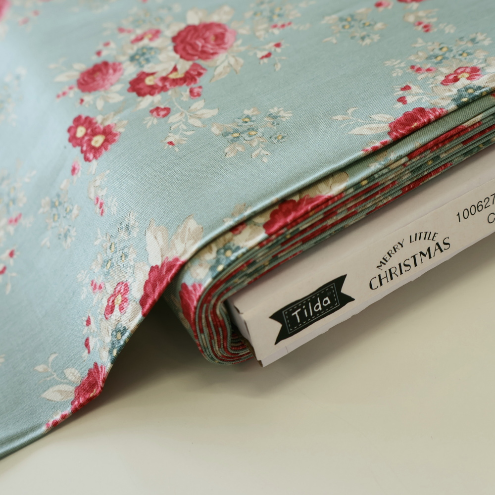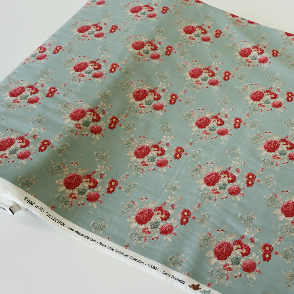 ノルウェー発のブランド「Tilda」より、2025年秋冬コレクションMERRY LITTLE CHRISTMASのフローラル柄Carol。淡いダックエッグブルーの地に、深紅のローズと小花が咲き誇る可憐なデザインです。透明感のあるブルーと優しい色調が絶妙に調和し、冬の空気を感じるやわらかな雰囲気をまといます。