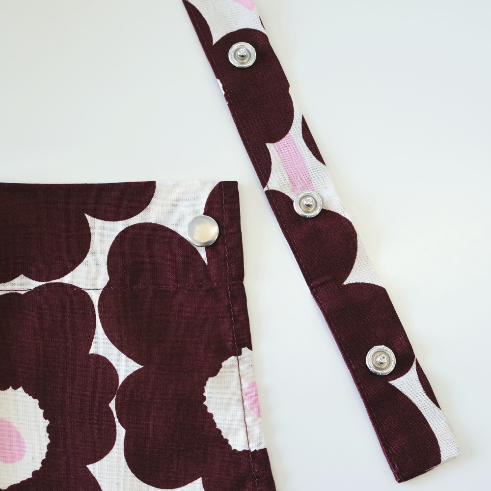 しっかりした生地感で長く愛用できる一枚。首紐のスナップが地味に便利で、家事がはかどります。