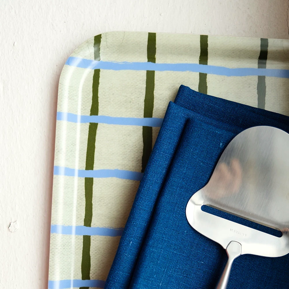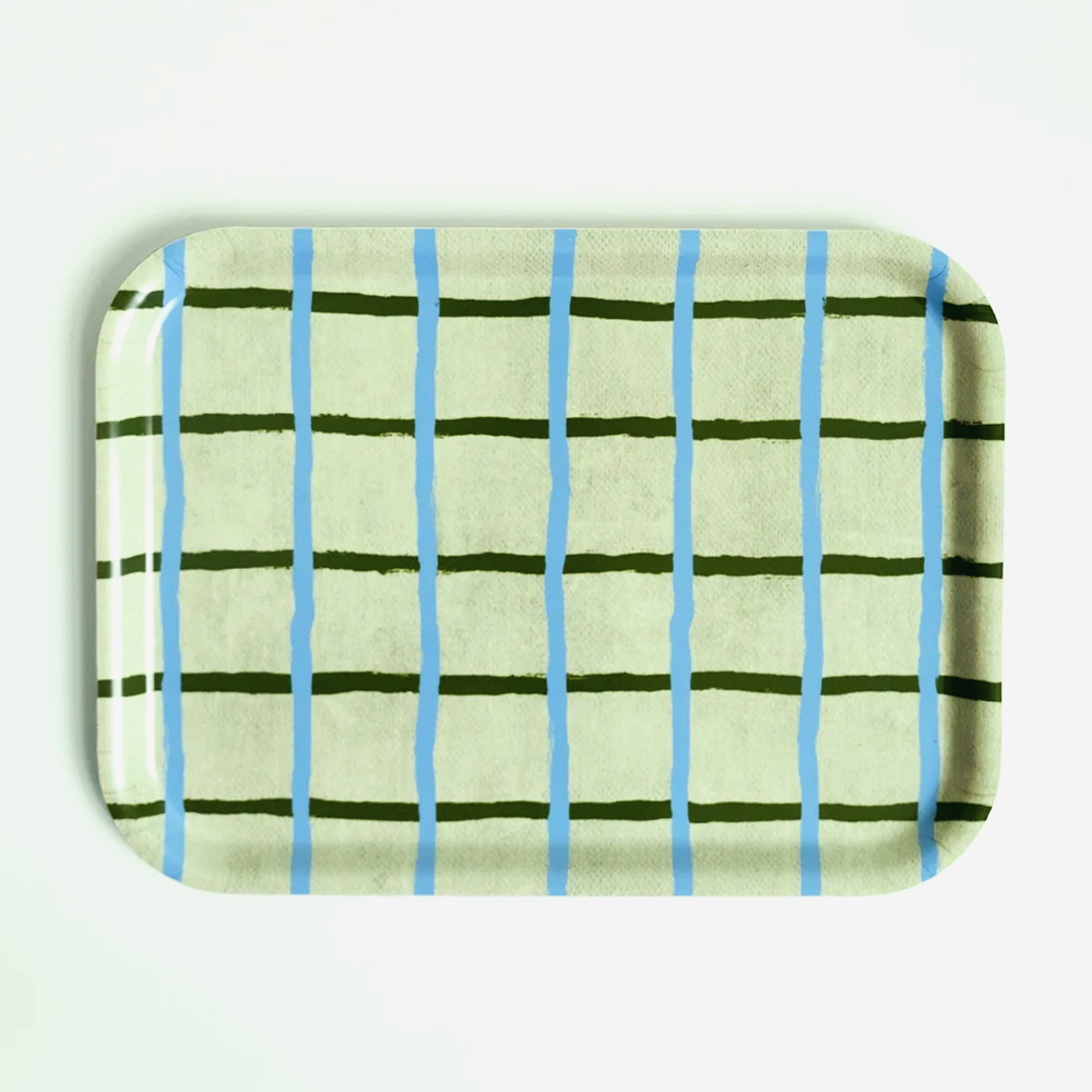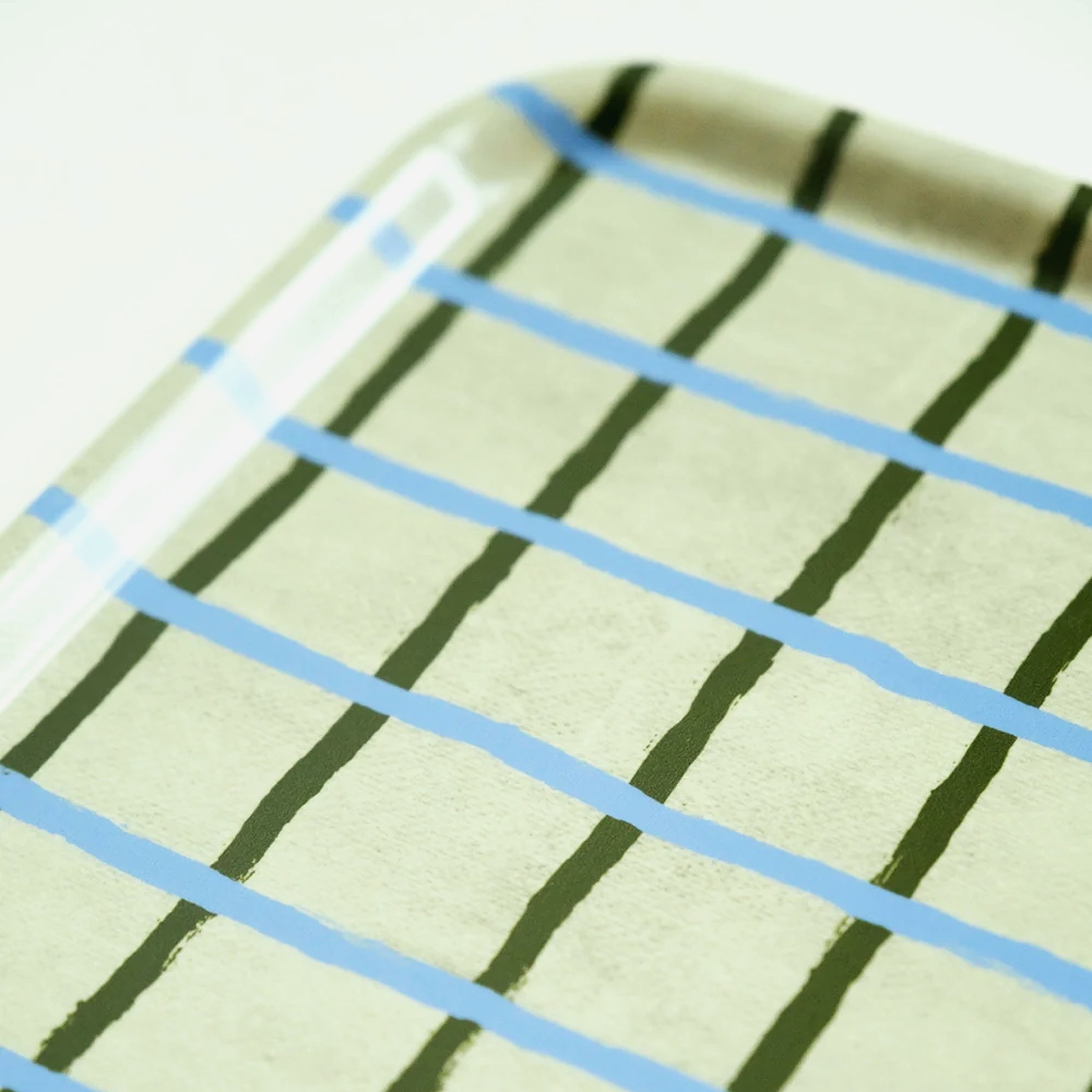 「Fine Little Day」のRUTIG(ルティッグ)トレイ。 手描き風のチェック柄がやさしいピスタチオグリーンに映える27×20cmサイズです。マグとお菓子をのせるカフェトレイや、玄関の鍵置き、小物をまとめるインテリアトレイとしても活躍します。