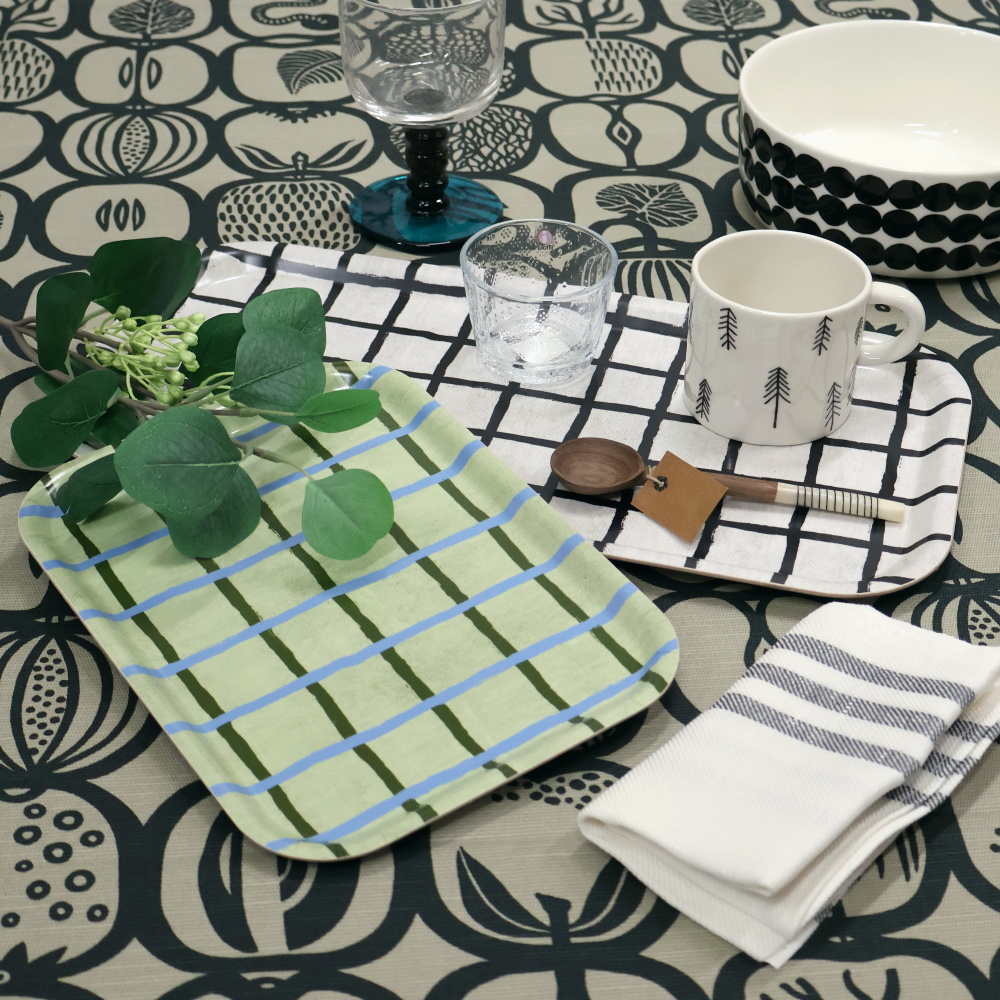 同シリーズのブラックチェック柄と並べても美しく、ナチュラルな木の食器やマリメッコのテキスタイルともよく合います。朝の食卓やカフェトレイとして、暮らしの中に北欧のリズムを添えてくれます。
