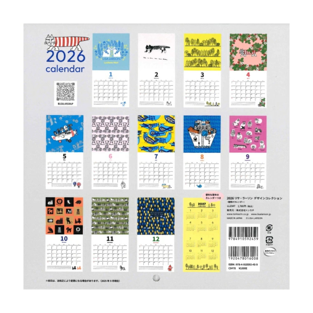シンプルな日付デザインに、リサ・ラーソンの愛らしいキャラクターたちが毎月登場します。予定管理と癒しの両方を叶える、2026年限定の北欧デザインカレンダーです。