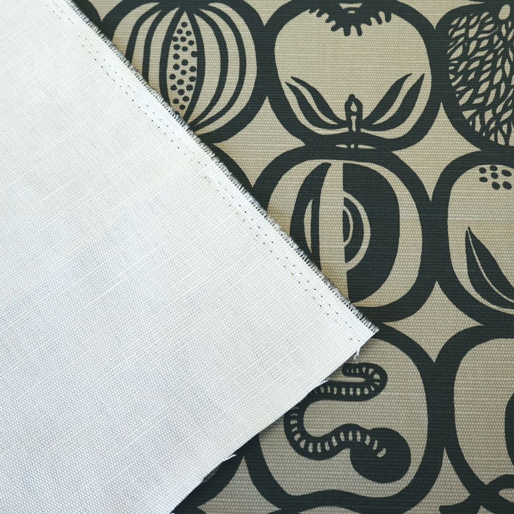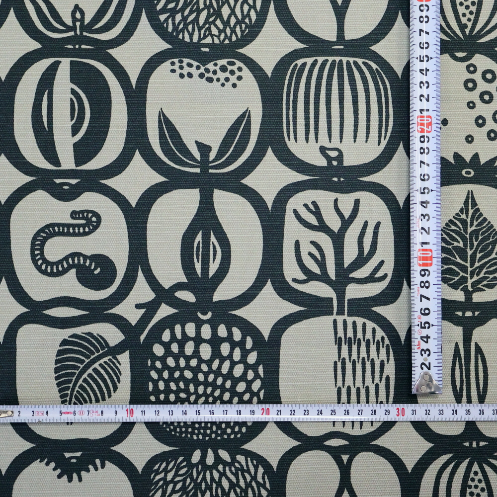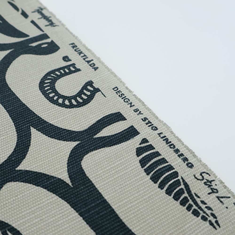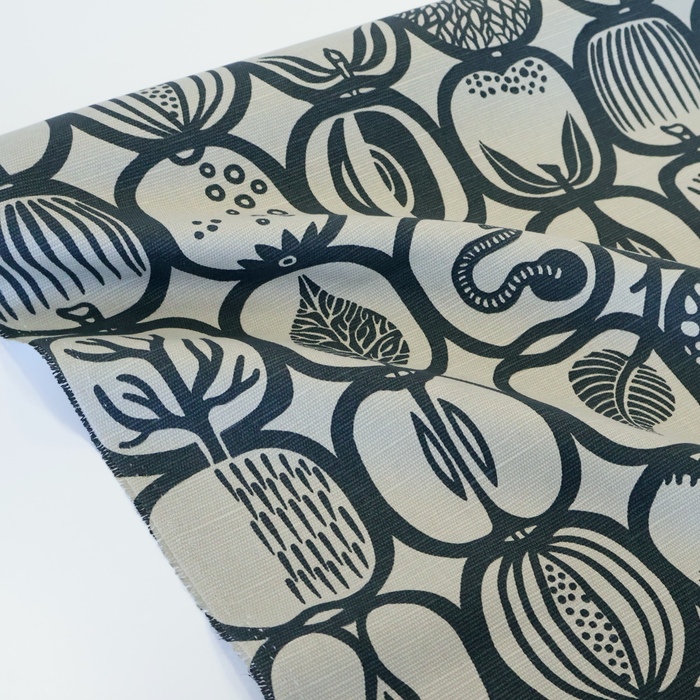 素材はコットン×リネンの混紡生地。リネンのハリと、コットンのやわらかさを併せ持ち、インテリア用途から雑貨制作まで幅広く使える素材感です。ナチュラルな風合いがFruktladaの柄とよく合い、使い込むほどに雰囲気が増していきます。