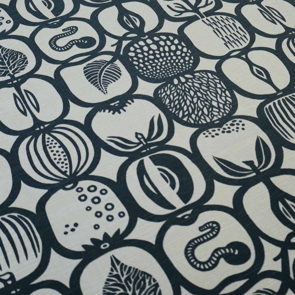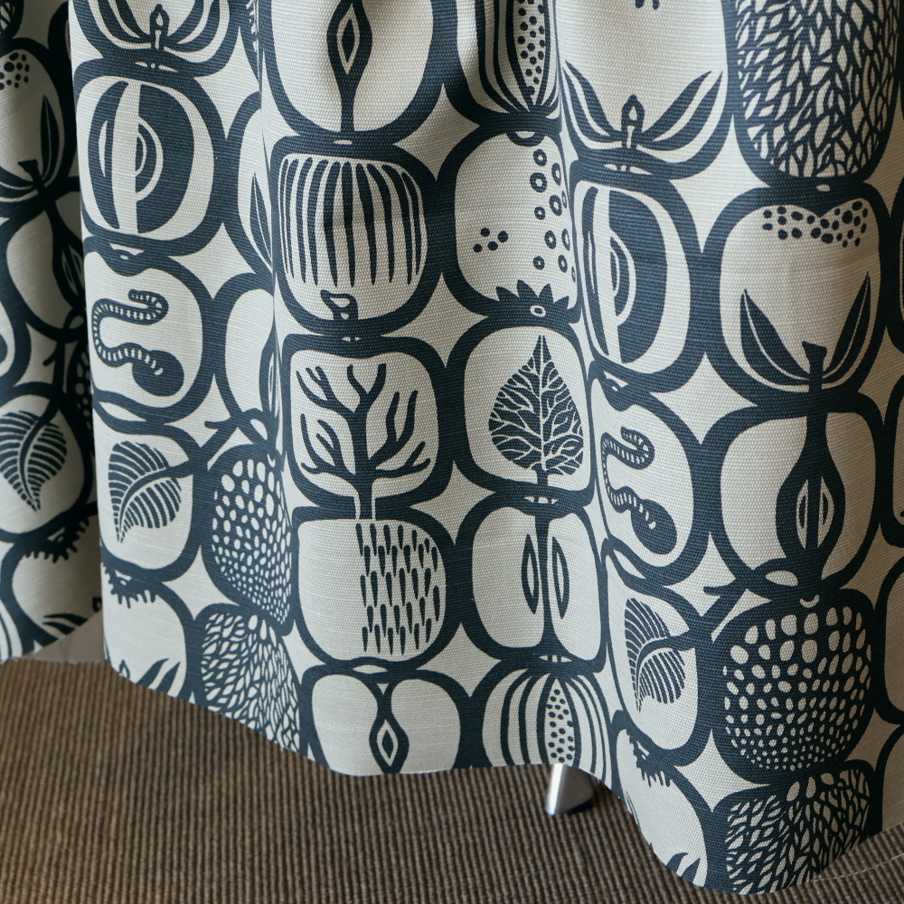 Fruktladaは、モチーフの反復によって生まれるリズム感が特徴です。きっちりと並んでいるのに堅く見えないのは、線の太さや形のわずかな違いがあるから。眺めていると、視線が自然と流れ、布全体に軽快な動きが感じられます。