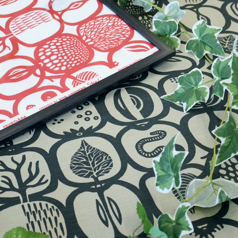 Fruktladaに描かれているのは、リンゴや洋梨を思わせる果実たち。しかし写実ではなく、形を単純化し、箱に収めるように配置することで、模様としての完成度が高められています。キッチンやダイニングと相性の良いモチーフでありながら、インテリア全体に自然に溶け込む、リンドベリらしいバランス感覚が光ります。