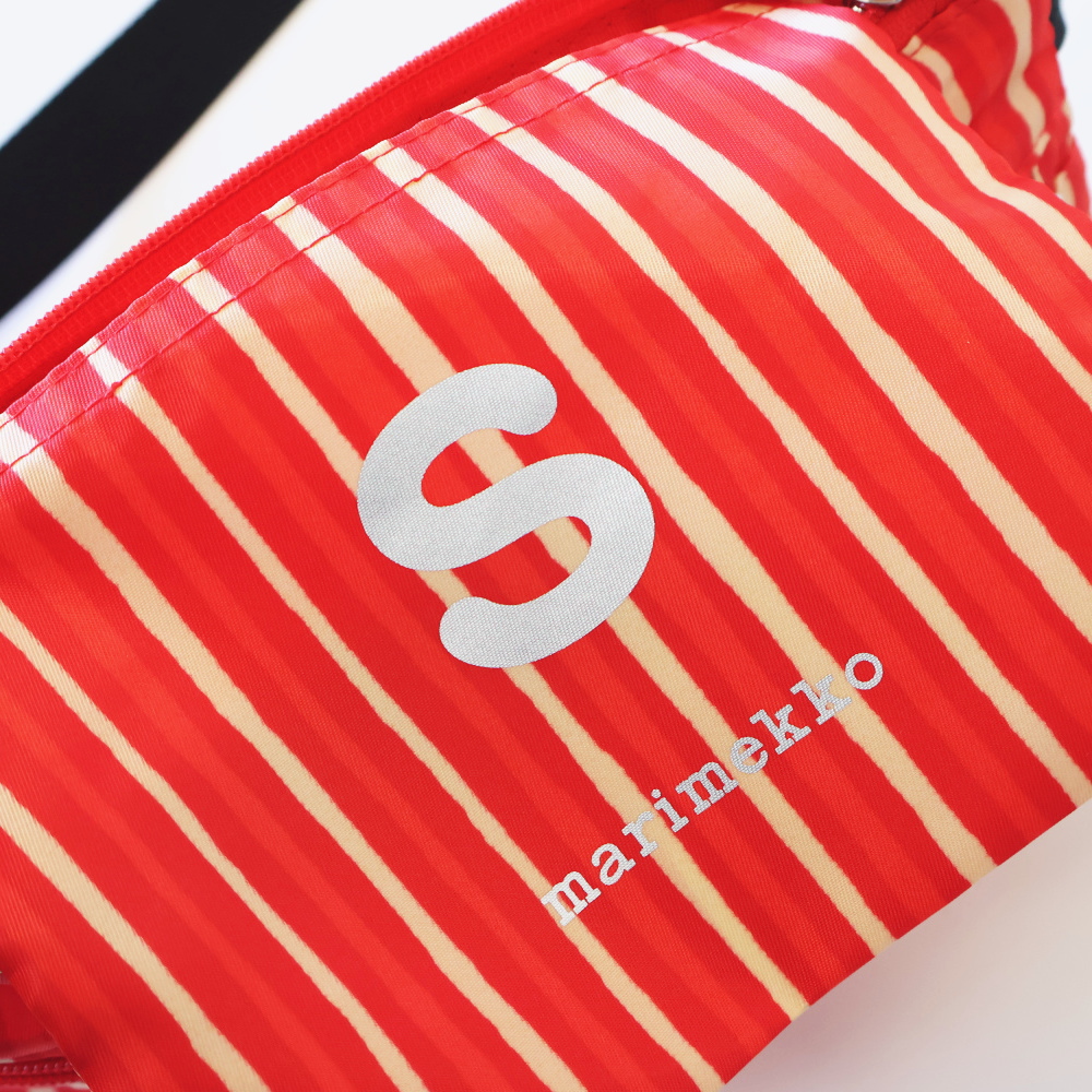 marimekko(マリメッコ)のロゴが映える、レッドストライプ柄のショルダーバッグ「Neat Crossbody Piccolo S」です。軽量でコンパクトながら、スマホや長財布など日常の持ちものがすっきり収まるサイズ感で、斜めがけにすると両手が空くので、旅行や街歩きのときにも使いやすいバッグです。
