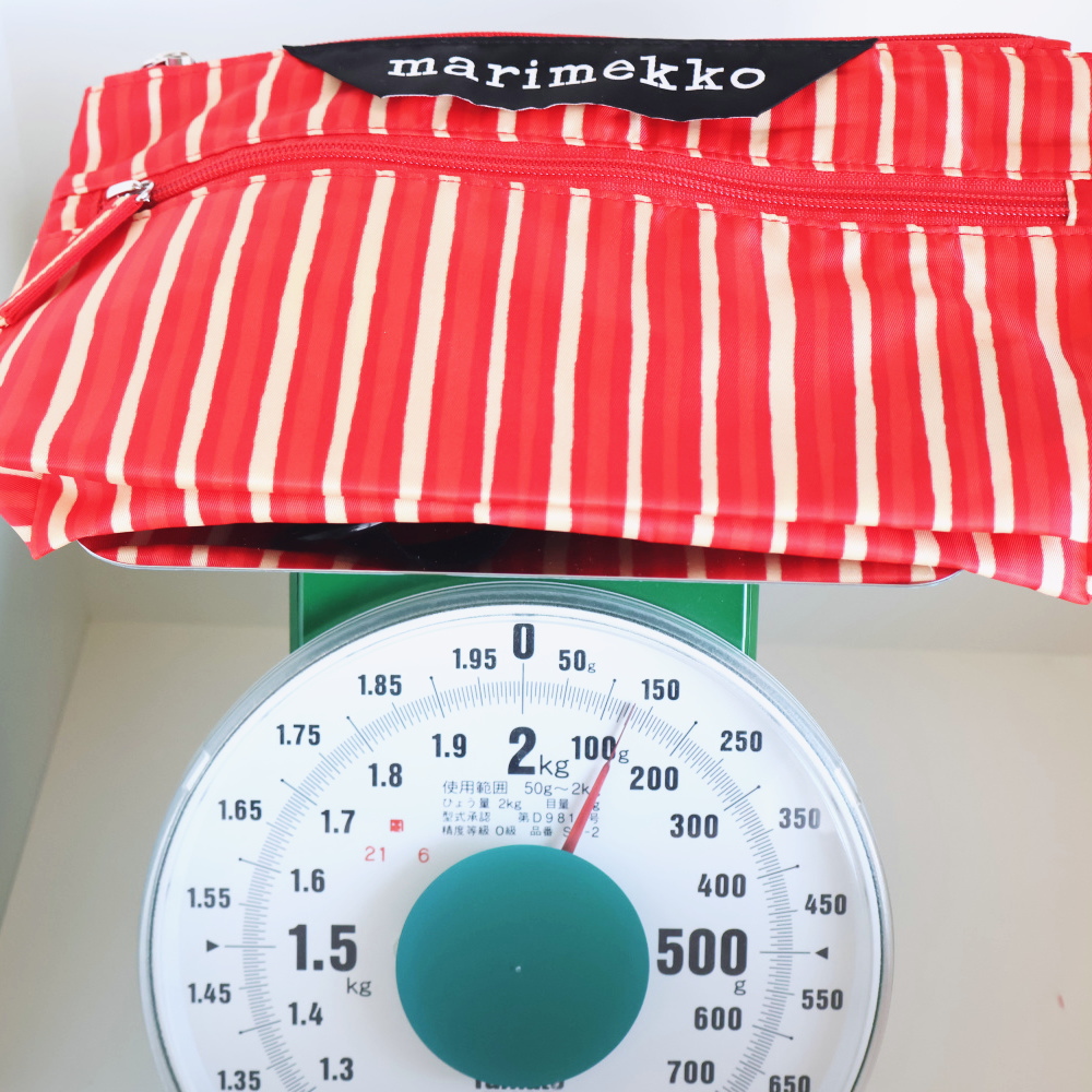 フロントにはmarimekkoのロゴタグ、ベースには縦ストライプの柄。鮮やかなレッドですが、線のリズムがあるので、服に合わせると強くなりすぎず、アクセントとしてちょうどいい存在感です。