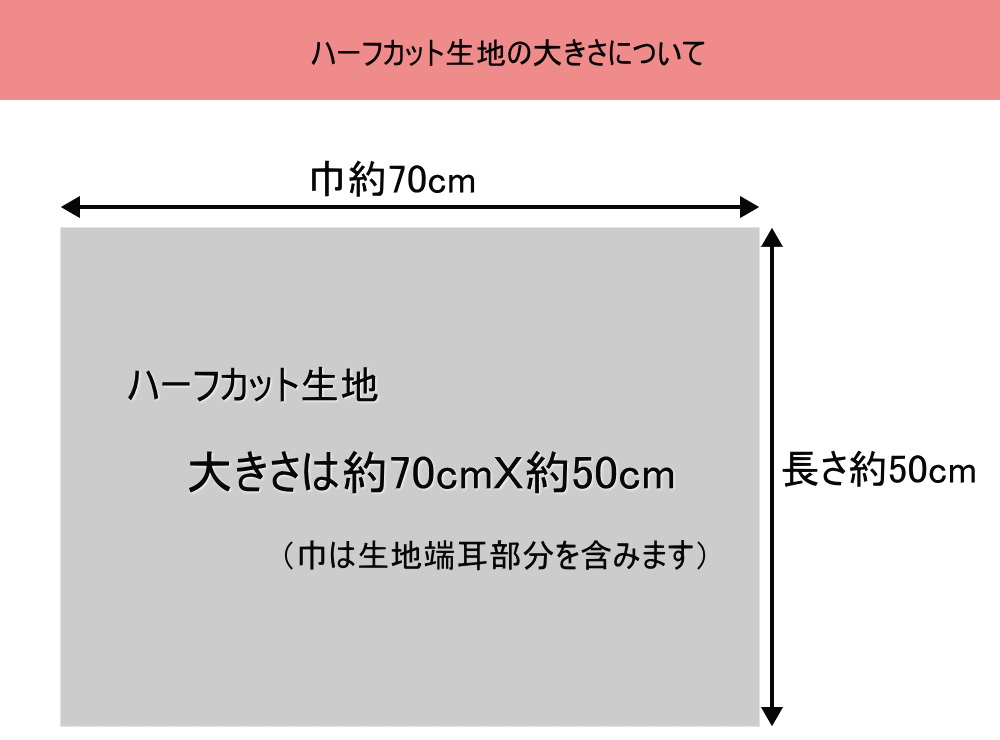 こちらは生地全巾を半分にカットしたサイズです。右側または左側のどちらかに、耳部分(無地の余白)が入ります。
