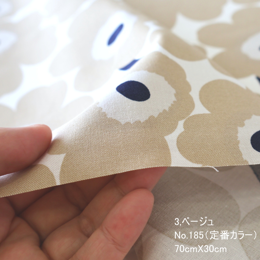 マリメッコの定番柄Mini Unikkoを、色違い3枚でまとめたセットです。レッド(No.1)、ブラック(No.190)、ベージュ(No.185)の定番カラーを少しずつ楽しめる内容。小物づくりや色合わせのお試しにも使いやすいサイズ感です。
