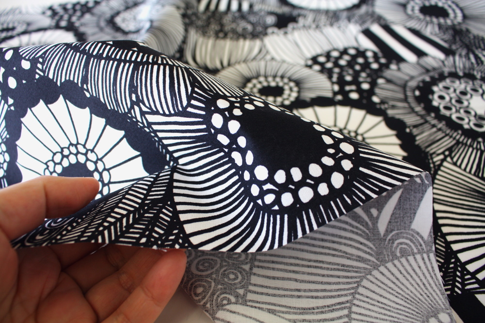 綿100%の平織りファブリックで、薄手ながらしっかりとしたハリがあります。クッションカバーやポーチなど、日常づかいのアイテムにも向いた厚みです。裏面にも柄がうっすらと見え、カフェカーテンなど光を通すアイテムに仕立ててもきれいに映えます。
