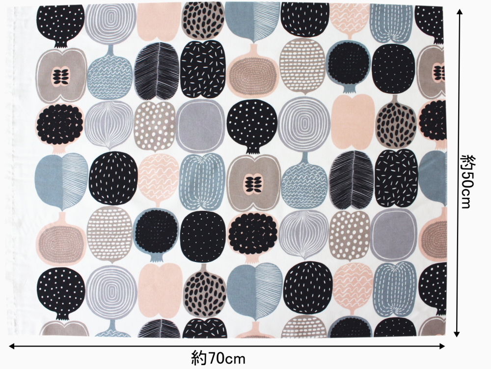 1枚あたりのサイズは約70×50cm(無地部分を含む)です。生地全巾を半分にカットしたハーフカットサイズで、ファブリックパネルやランチョンマット、ポーチやバッグの一部使いなど、小物づくりに取り入れやすい大きさです。