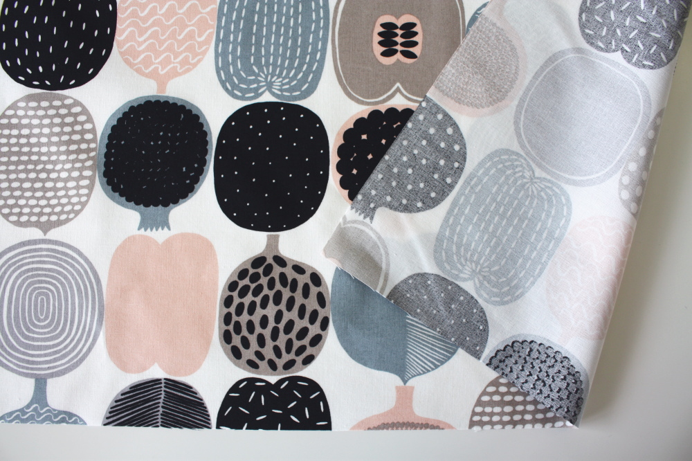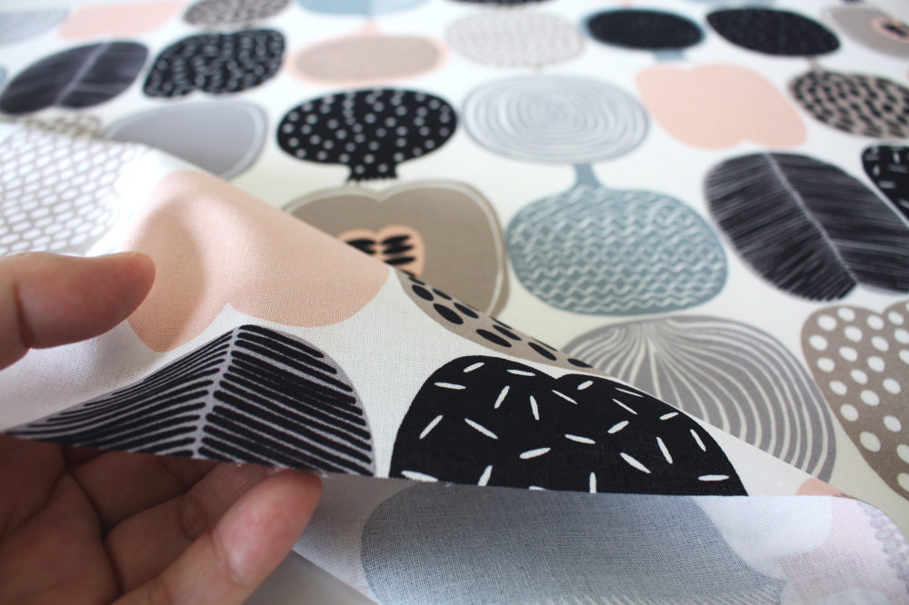 素材は綿100%の平織りファブリック。薄手ながらほどよいハリがあり、バッグやクッションカバーなど日常使いのアイテムにも適した厚みです。裏側から見ても柄がわかるプリントなので、カフェカーテンや間仕切りなど光を通すアイテムにもきれいに仕上がります。