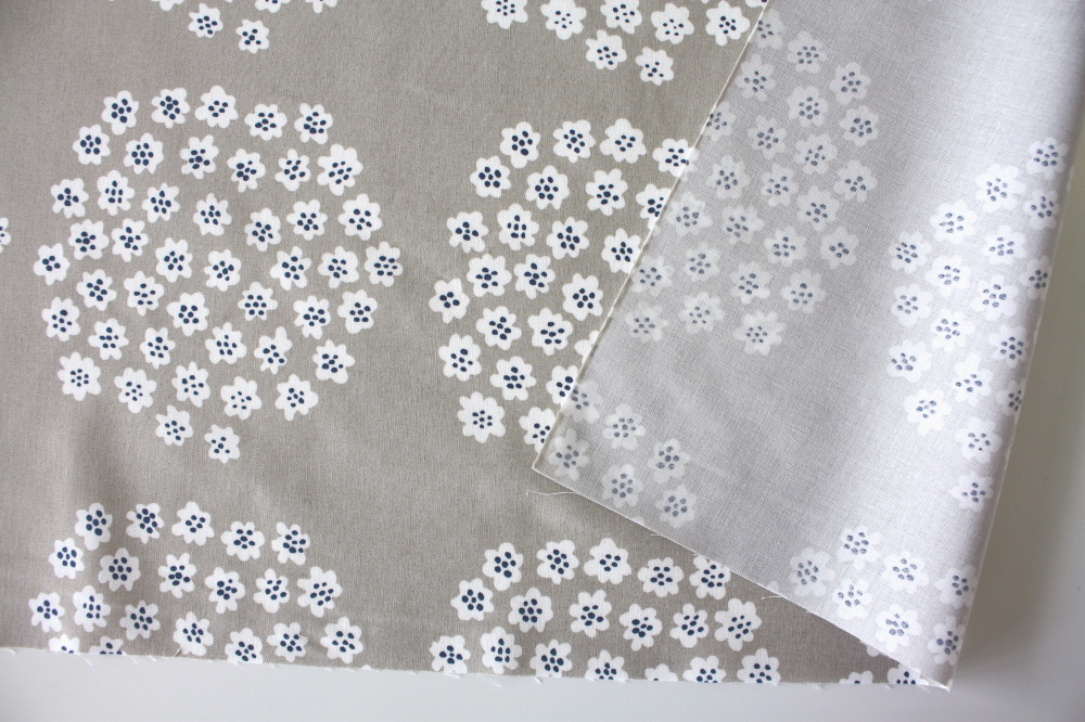 ハーフカットのため、生地の左右どちらかに耳(無地部分)が入ります。裏面から見ても柄が分かるプリントで、カフェカーテンなど光を通すアイテムに仕立ててもきれいに映えます。