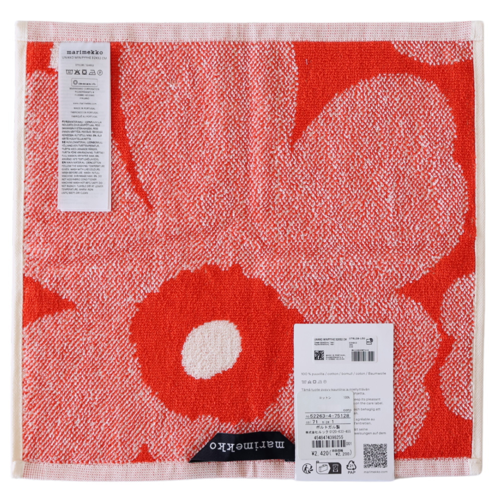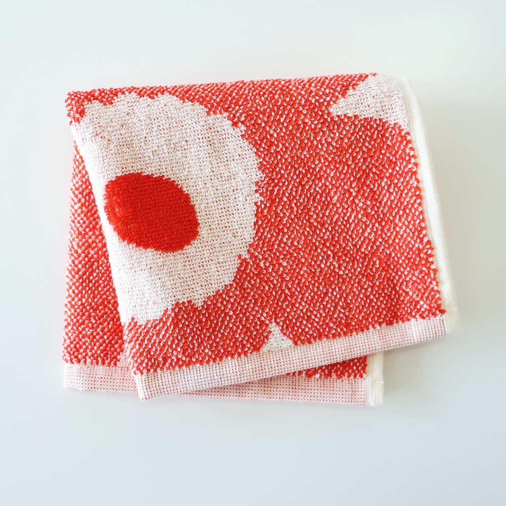 Unikkoはいろいろ見てきましたが、このミニタオルは「花がちゃんと主役」なのがいいなと思いました。サイズが少し大きめなので、柄が窮屈にならず、どんと一輪がきれいに見えます。オレンジレッドも強すぎず、オフホワイトと細かな織りの切り替えのおかげで、思ったよりやさしい印象。いつものUnikkoとは少し違う雰囲気を楽しみたい方に、ちょうどいい一枚です。
