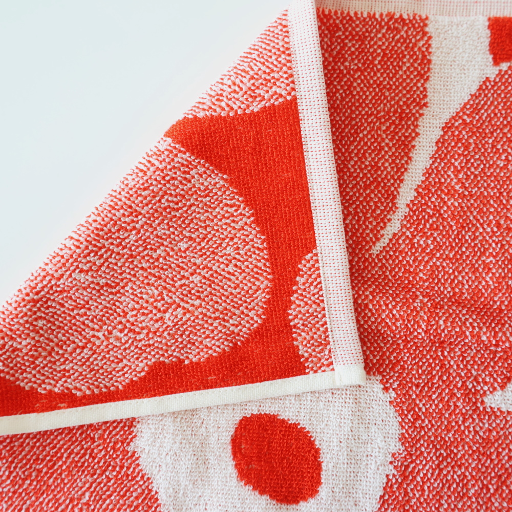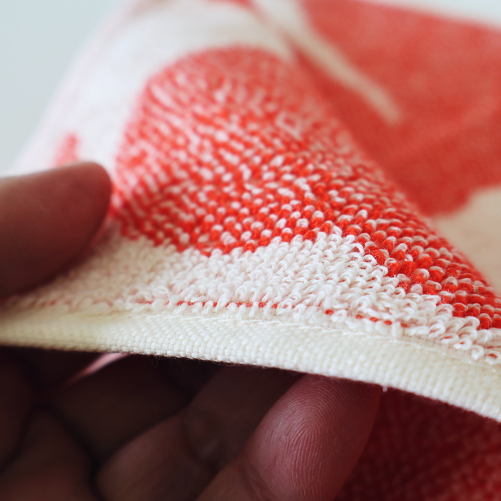 表と裏で色味の出方が異なり、同じ柄でも印象が変わります。オフホワイトとオレンジレッドが反転することで、使うたびに少し違う表情を見せてくれるのも、このタオルの魅力です。