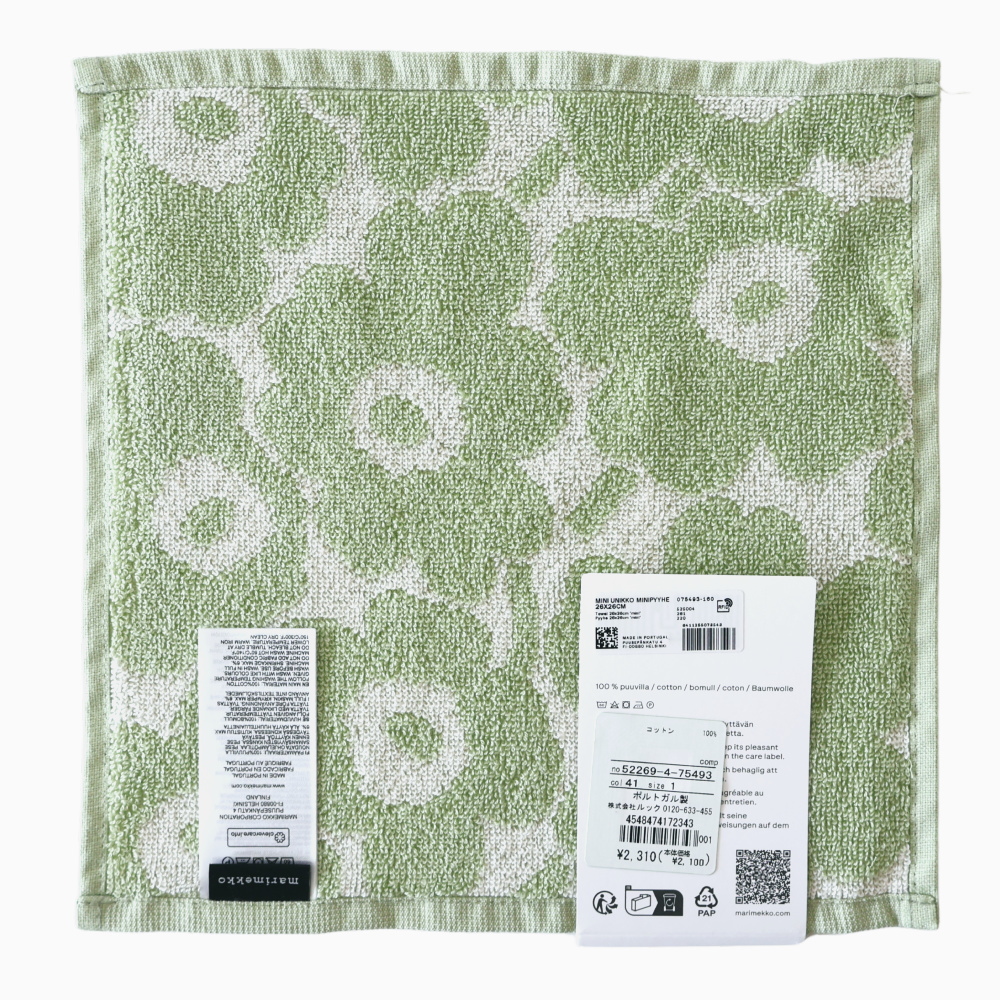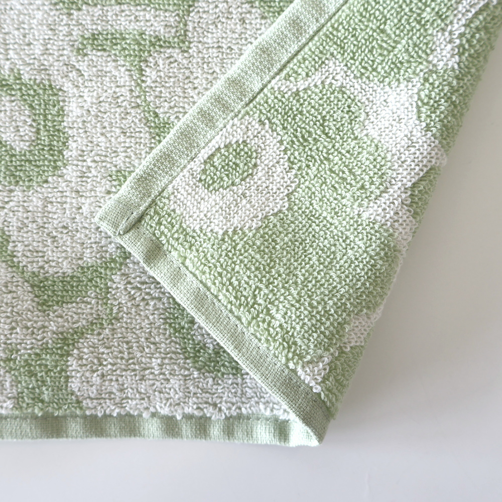 なぜこのミニタオルを選びたくなるのか考えてみると、春らしいライトグリーンに、ウニッコの花がやさしく浮かび上がっていること。そして見た目だけでなく、しっかりとした厚みがあって、毎日使える安心感があること。この2つが大きな理由だと思います。甘すぎず、男女問わず使いやすい色合いなので、北欧好きな方へのちょっとした贈りものにも選びやすい一枚です。