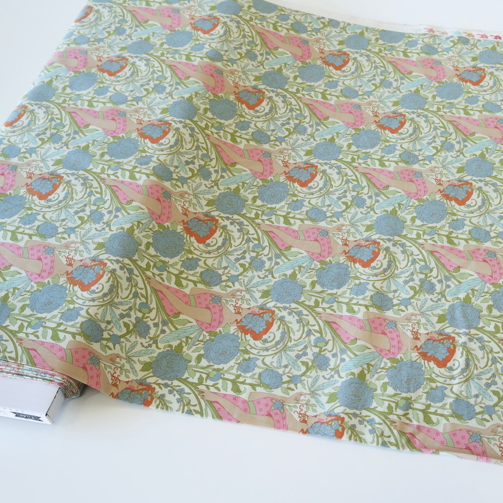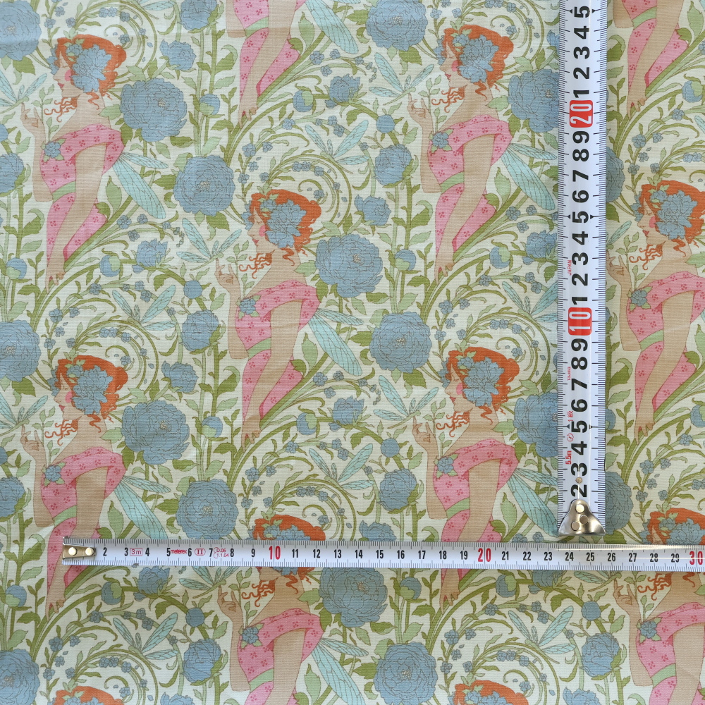 草花のあいだを舞う妖精とブルーの花々が連なる、物語を感じさせるデザイン。 淡いグリーンやピンクが重なり、かわいらしさの中に少しクラシカルな雰囲気があります。 クッションカバーやポーチ、パッチワークはもちろん、額装して飾るのもおすすめの柄です。