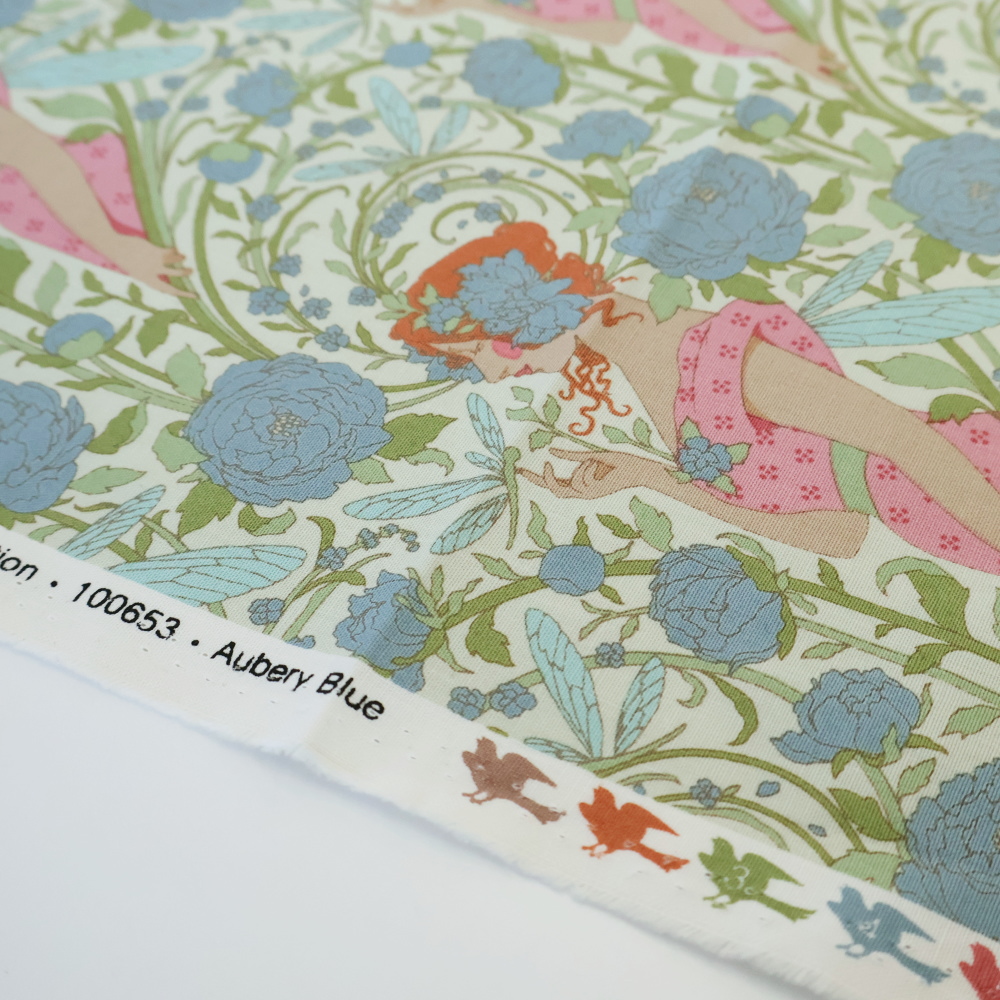 くるんとした赤い髪の妖精と、ブルーグリーンの花々、トンボの羽のようなモチーフが連なるAuberyは、見ているだけで空想がふくらむデザインです。北欧やイギリスのテキスタイルがお好きな方にも響く、少しアンティーク調の色合いが魅力です。