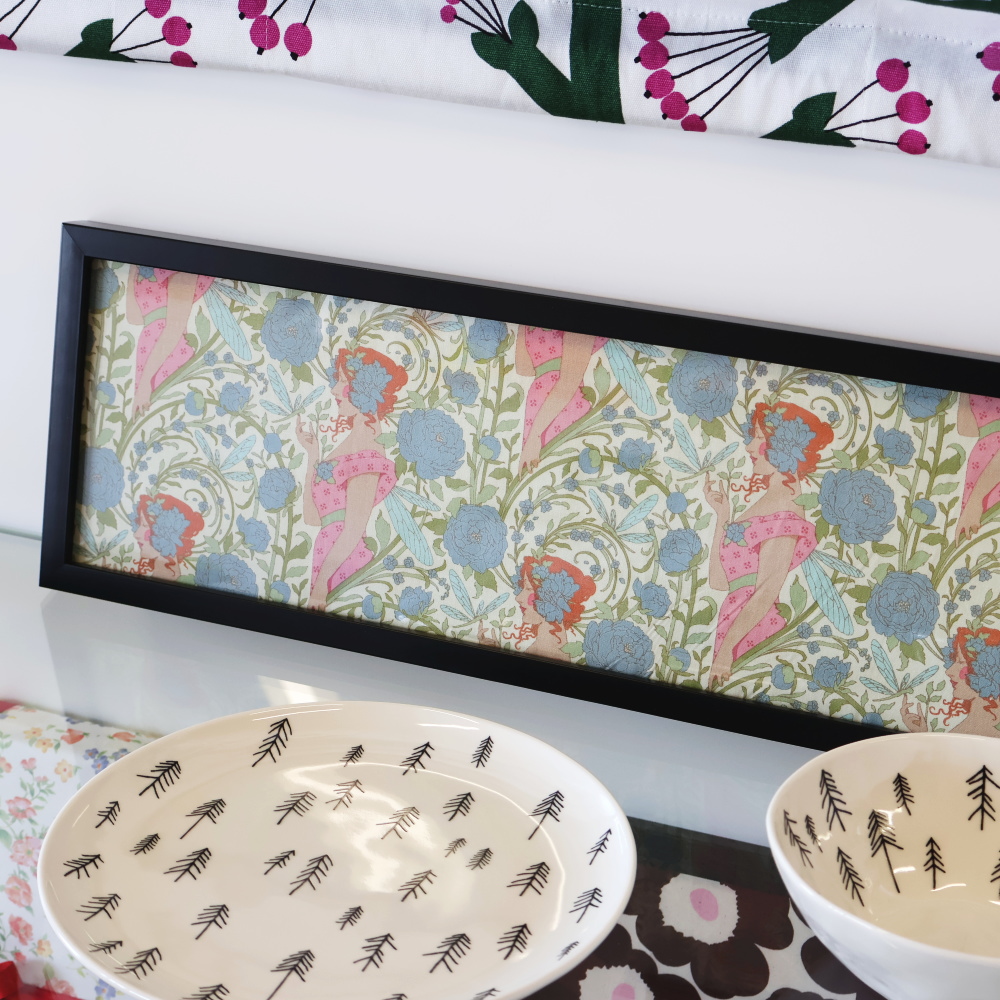 クッションカバーに仕立てると、妖精と花のストライプが面いっぱいに広がり、ソファまわりの主役に。細長いフレームに入れて額装すると、布ならではのやわらかさを残しつつ、アートプリントのような佇まいになります。
