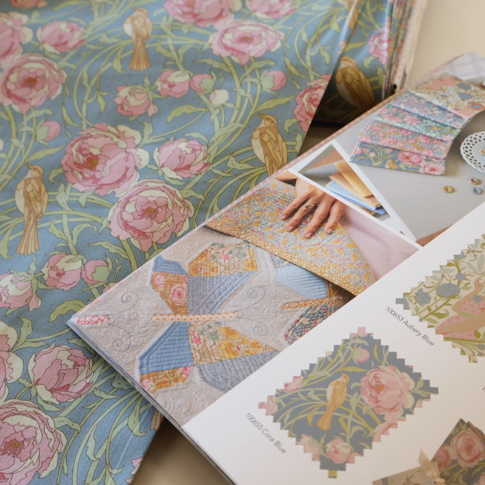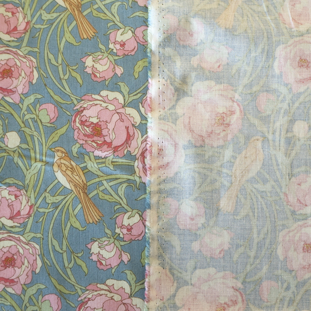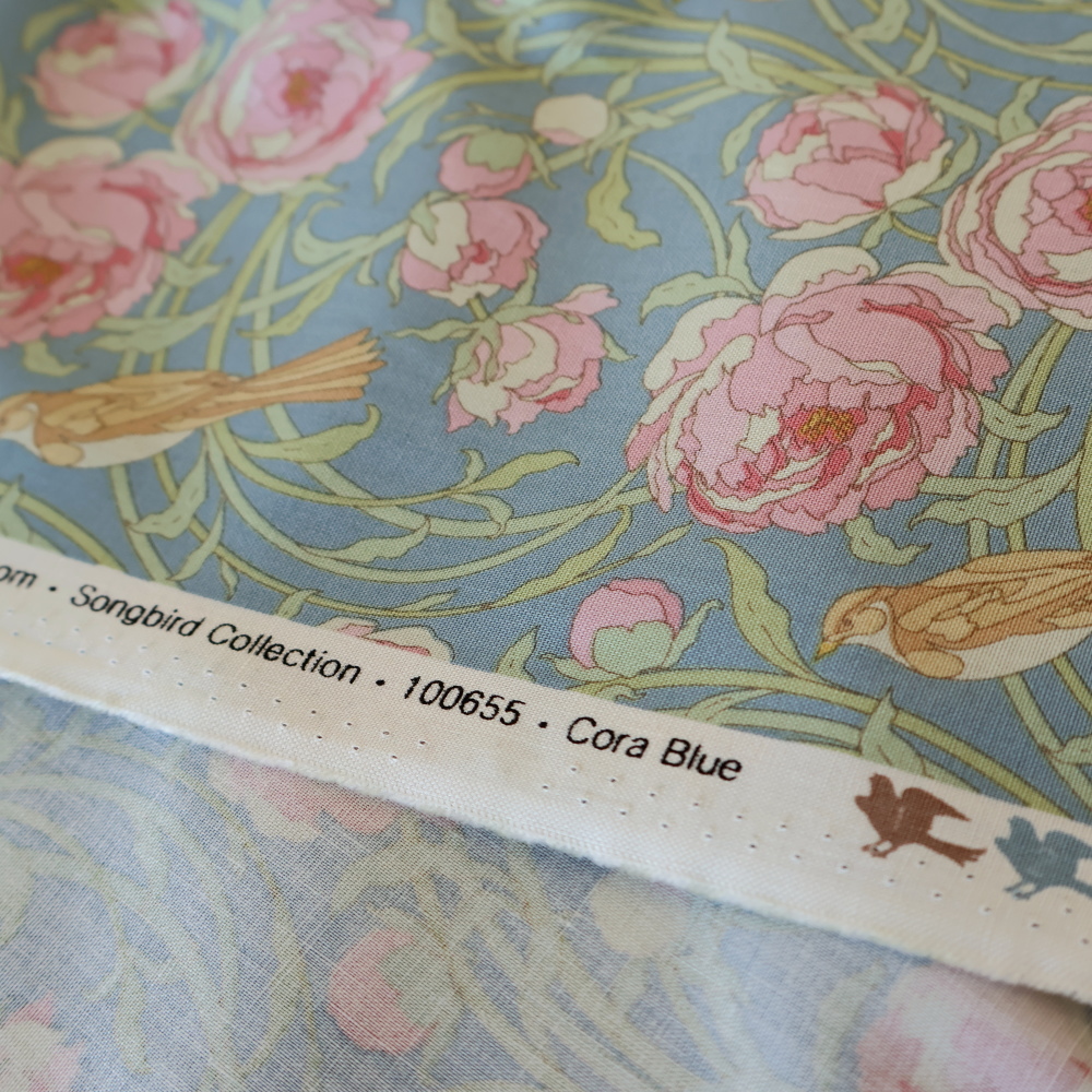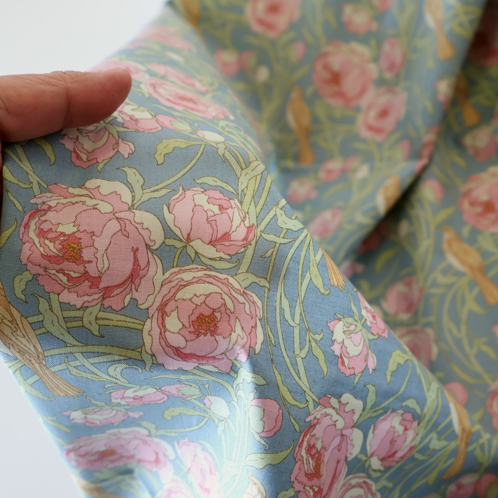 「Songbird」コレクションから、やわらかなブルー地に、ピンクの花と流れるようなつる葉、そして小鳥が描かれたクラシカルなプリントです。甘さはありつつも落ち着いたトーンで、小物づくりからクッション、パッチワークまで幅広く使いやすい柄です。