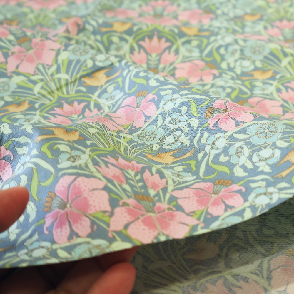 一見フローラルですが、よく見ると小鳥がしっかり主役。柄が細かめなので小さな作品でも雰囲気が出しやすく、作品づくりの気分をそっと上げてくれるブルーです。