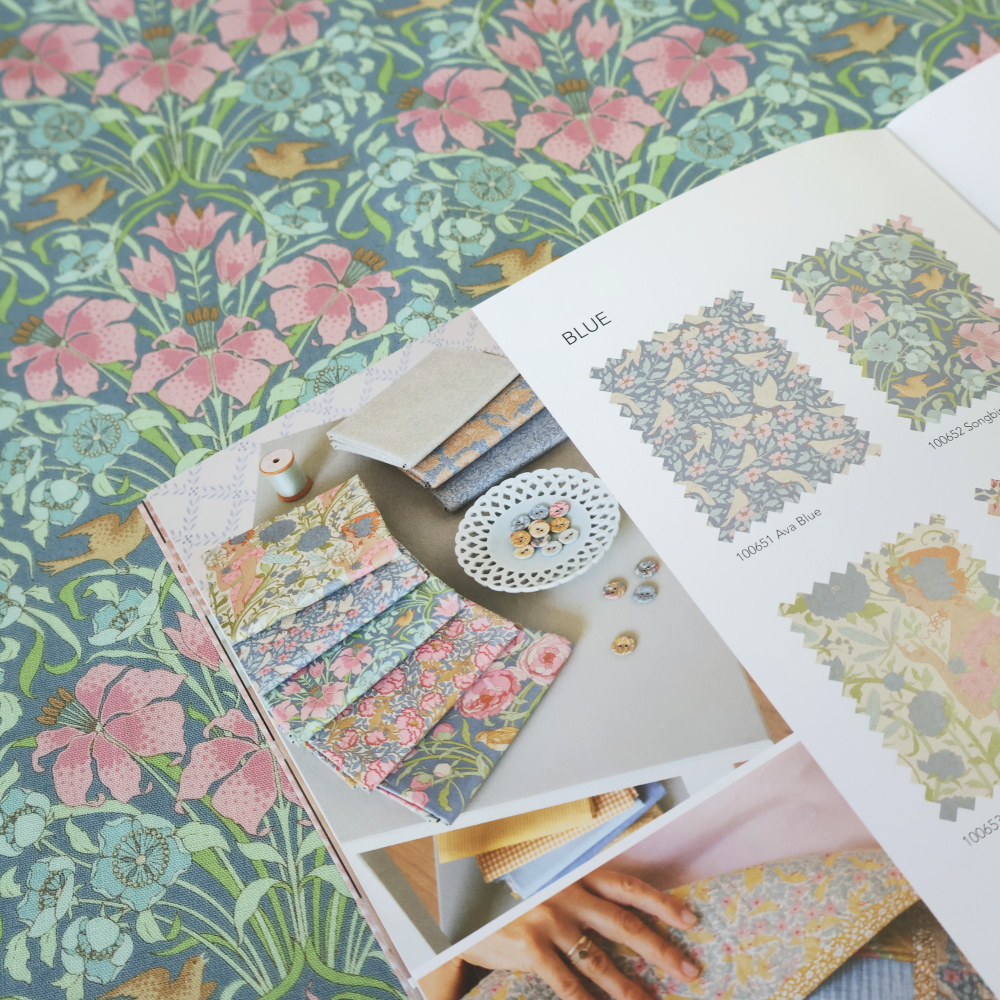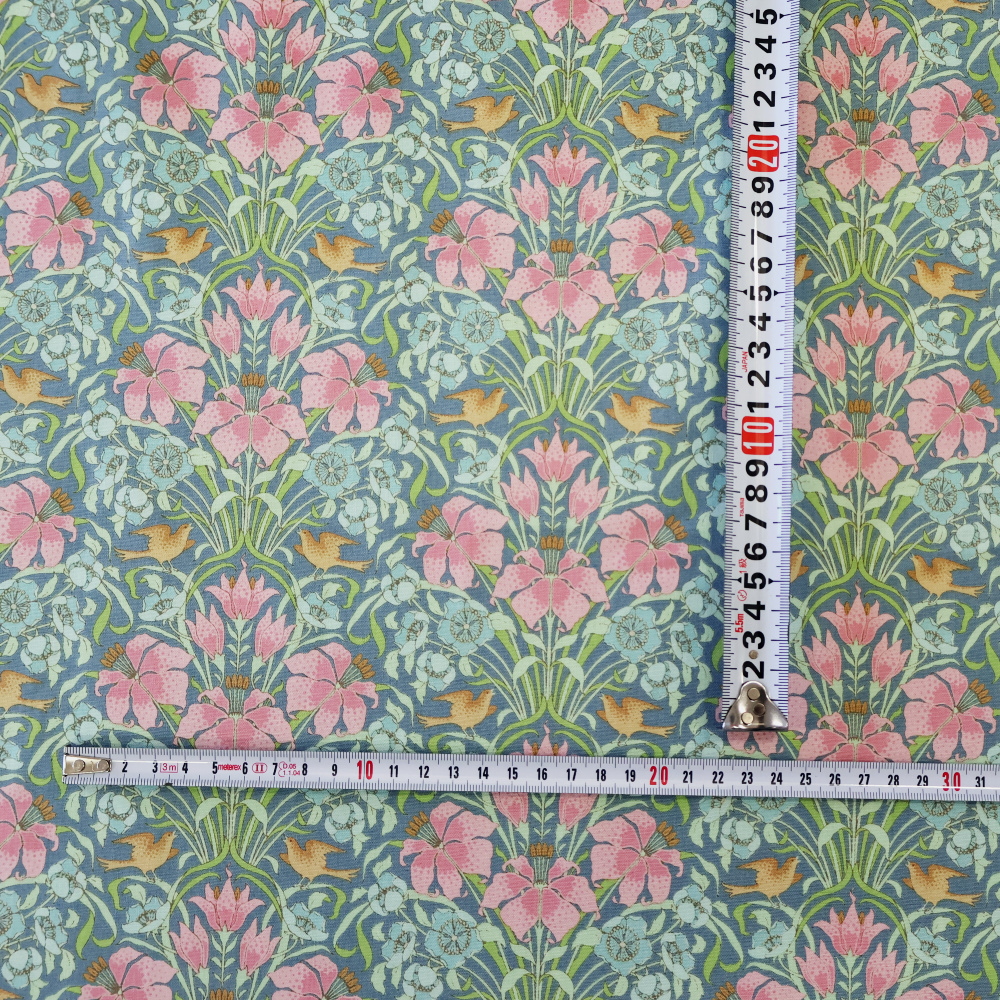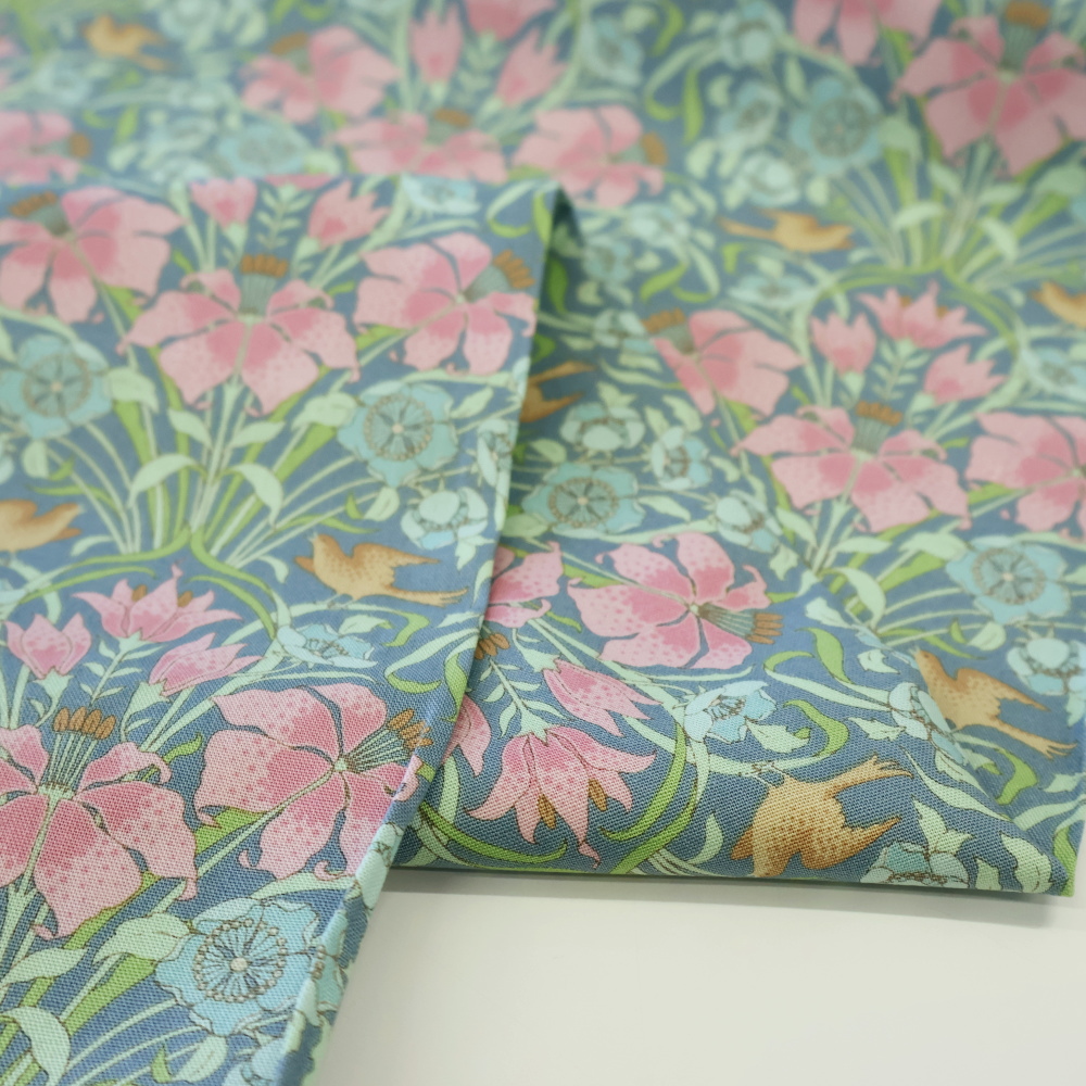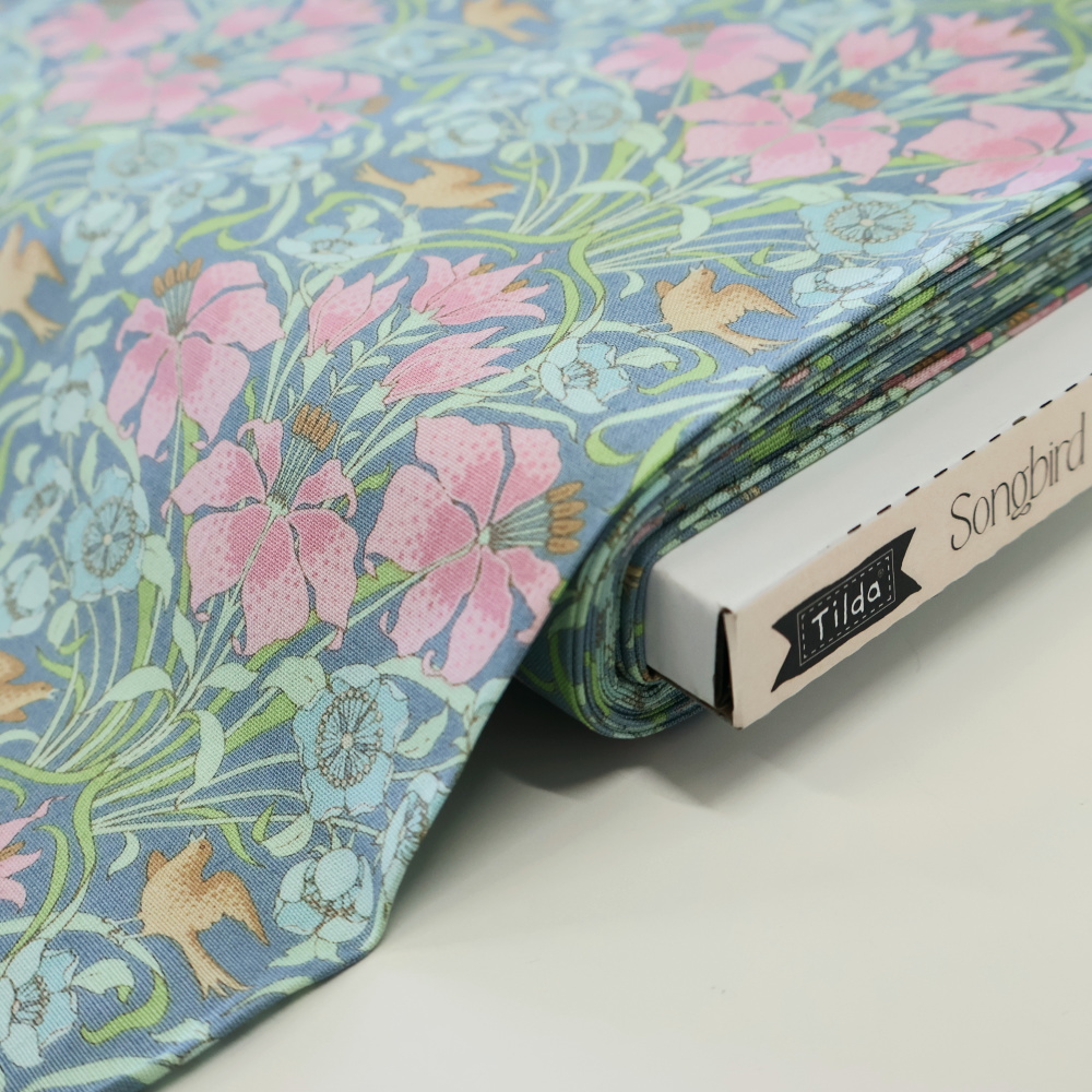 Tilda「Songbird」コレクションより。ややくすみを含んだブルー地に、ピンクの花と淡いブルーの小花、流れるようなつる葉が縦に伸びるクラシカルな構図です。小物づくりからクッション、パッチワークまで幅広く使いやすい柄です。