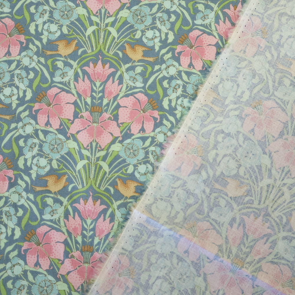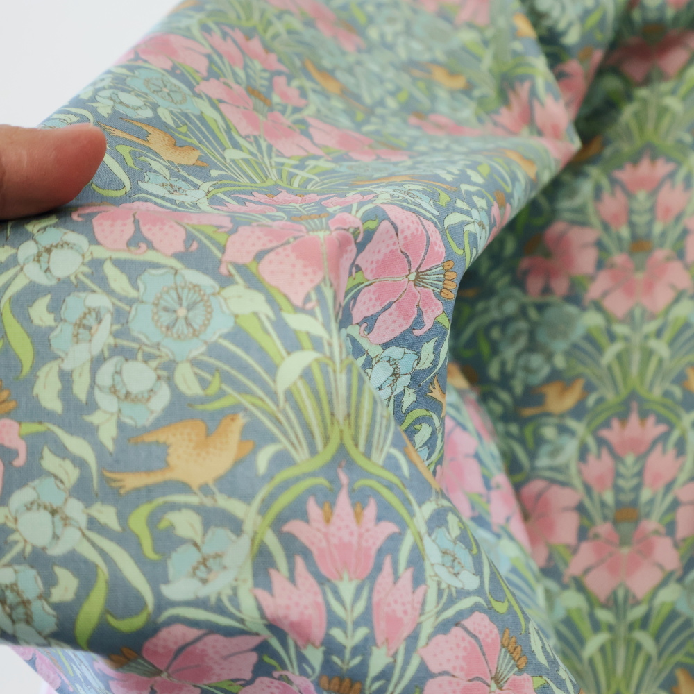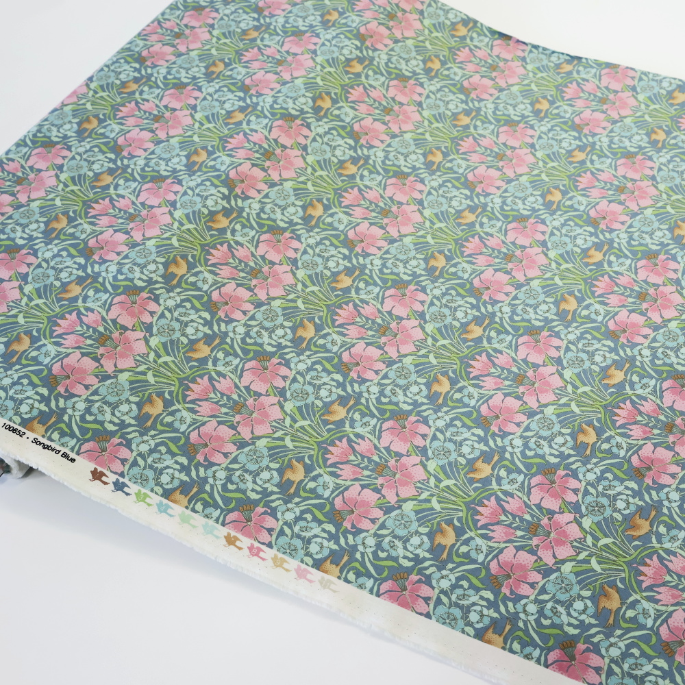 花の間にとまる小鳥は、口を開いてさえずる姿。装飾としてのモチーフではなく、ちゃんと“歌っている”のがこの柄の魅力です。コットンらしいなめらかな質感で、縫いやすさも安心。