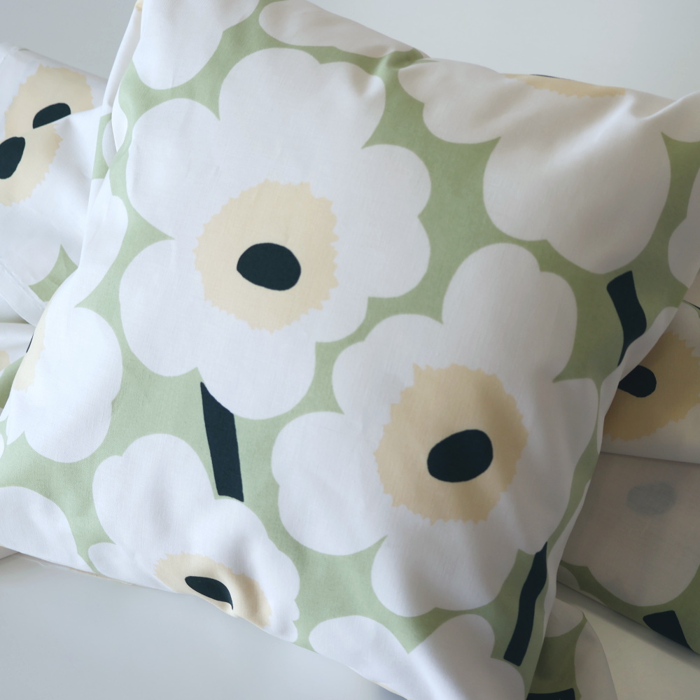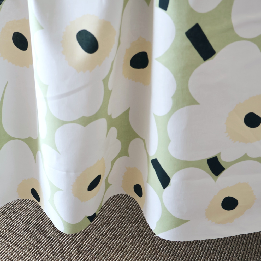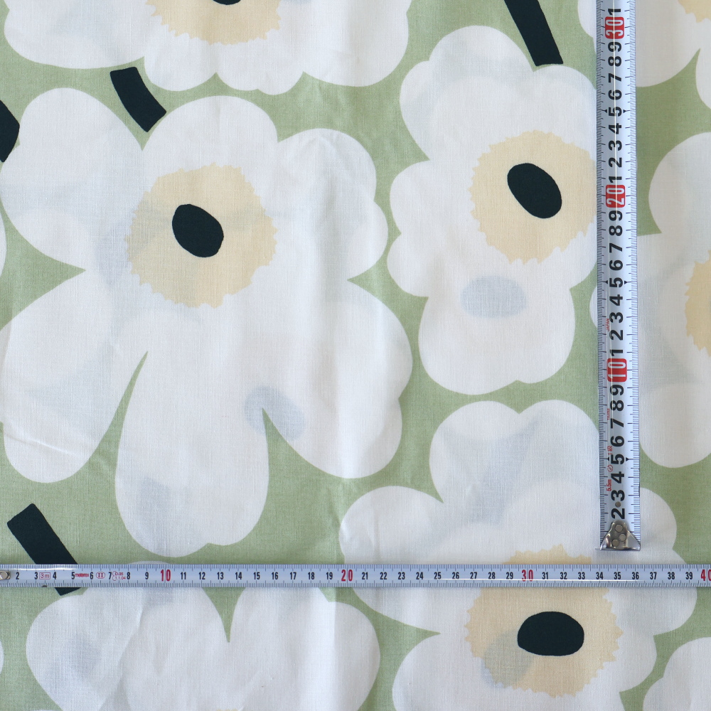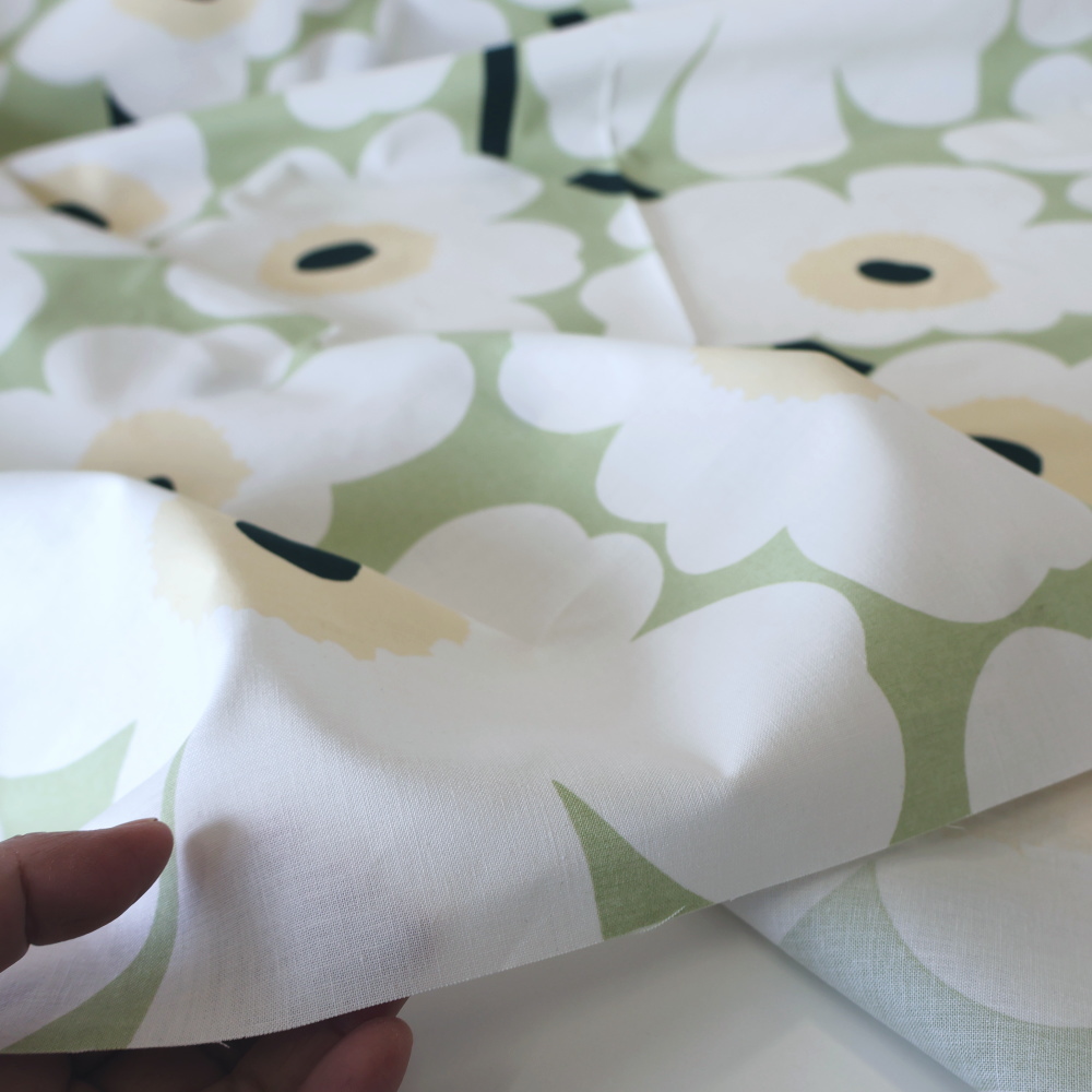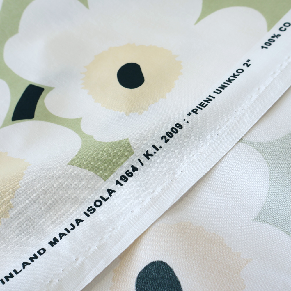 マリメッコを象徴するUnikko(ウニッコ)の〈Pieni Unikko 2〉。 やわらかなセージグリーンの地に、オフホワイトの花と淡いベージュの中心。 大胆な花柄でありながら、穏やかな配色で空間にすっとなじみます。 リサイクルオーガニックコットン100%のファブリックです。