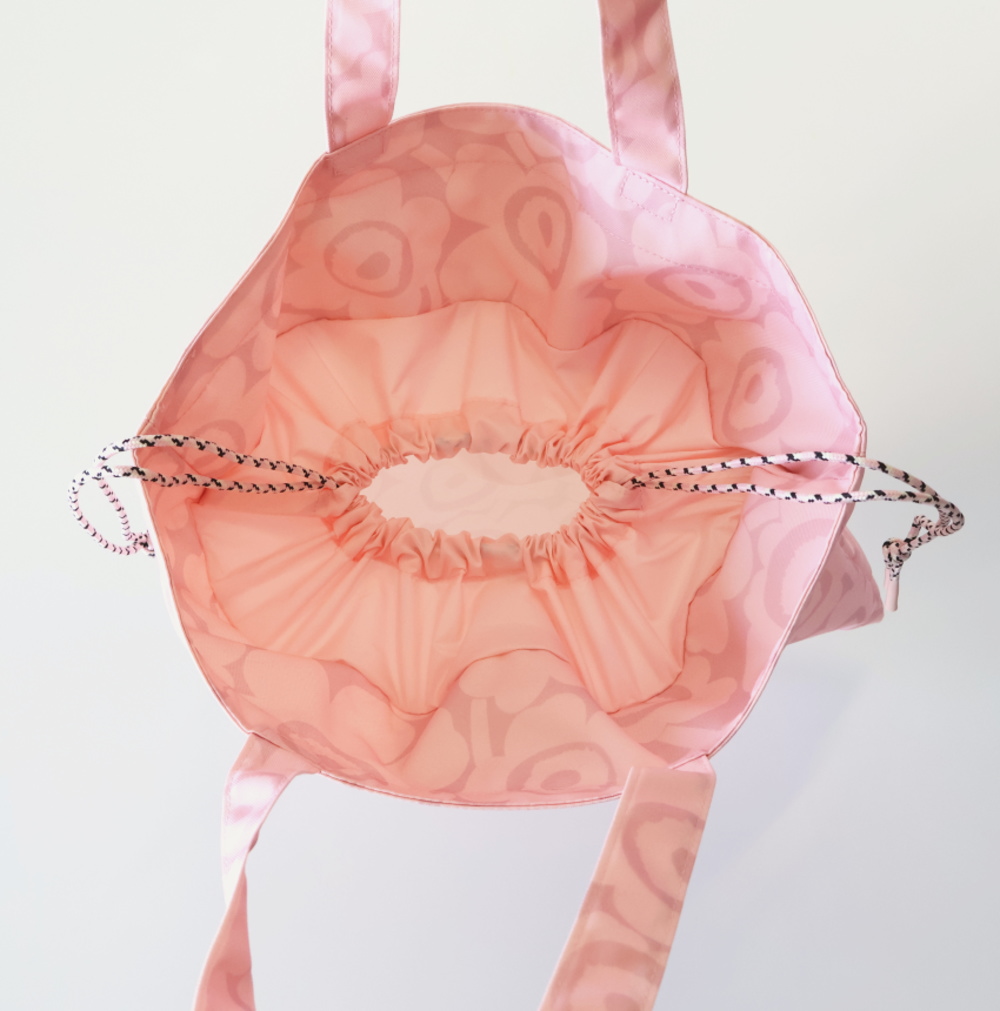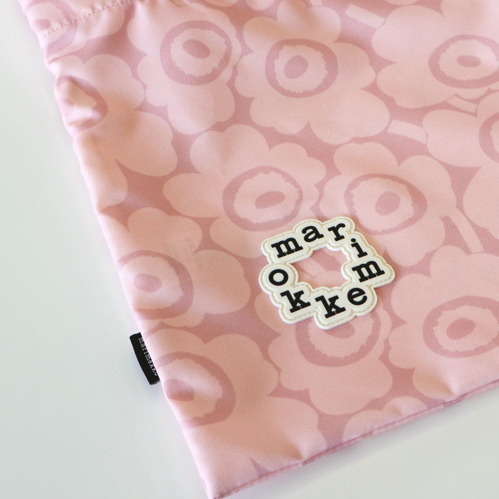 マリメッコのトートバッグMetka Mini Unikkoです。ブランドを代表するUnikko柄をやわらかなライトピンクのワントーンで仕上げた一枚。スクエア型としてはもちろん、トップを絞って巾着風フォルムでも楽しめる2WAY仕様で、装いを明るく軽やかに演出します。主素材にはリサイクルポリエステルを100%使用しています。