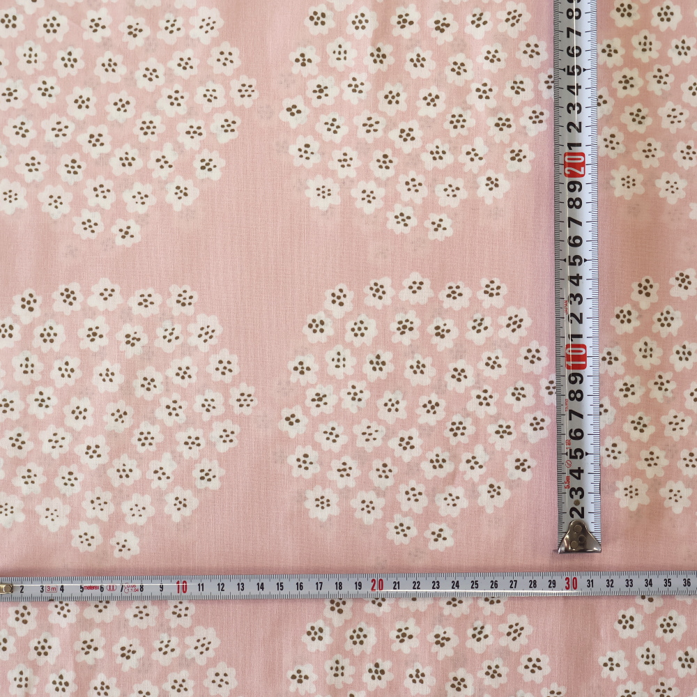 ○柄の直径は約14〜15cmで、ひとつひとつの小花は直径約1.5cmほど。遠目にはふんわりした花束、近くで見ると細かな小花がリズミカルに並ぶ表情が楽しめます。タテリピートは約62cm、生地巾は約145cmです。