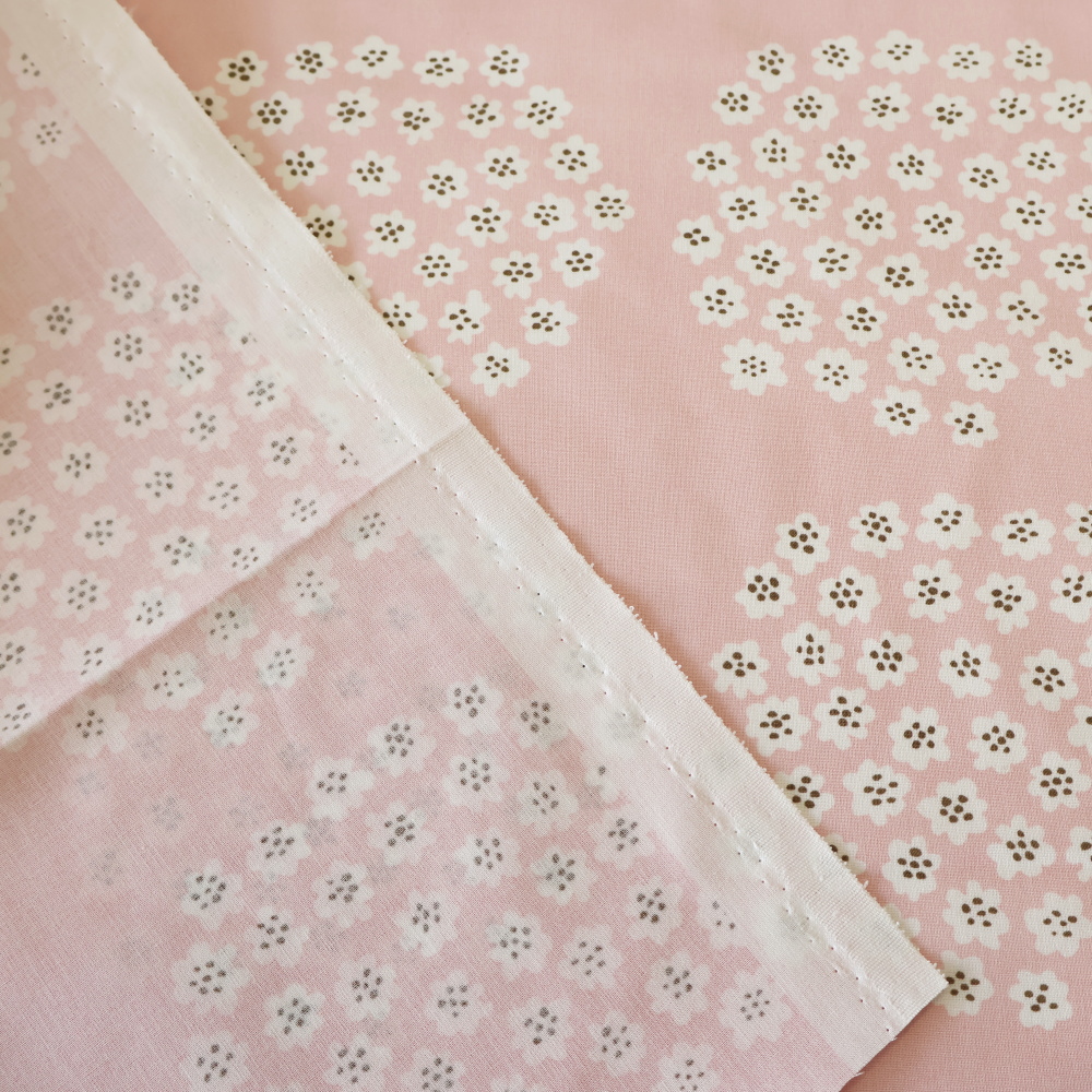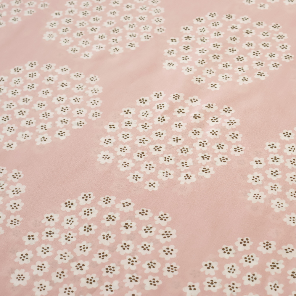 生地を大きく広げると、花束のような丸いモチーフがリズミカルに並ぶ様子がよくわかります。テーブルクロスやベッドスプレッドなど、大きめの面積に使うとデザインの魅力が引き立ちます。