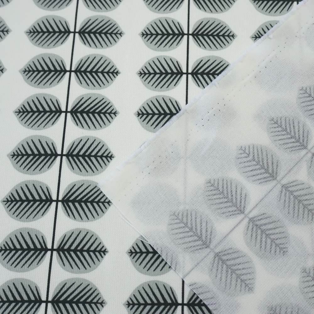 葉っぱが枝に沿って縦に並ぶ、リズミカルなパターンが印象的。幾何学模様のように整ったデザインで、北欧らしい温かみとグラフィカルな雰囲気をあわせ持っています。