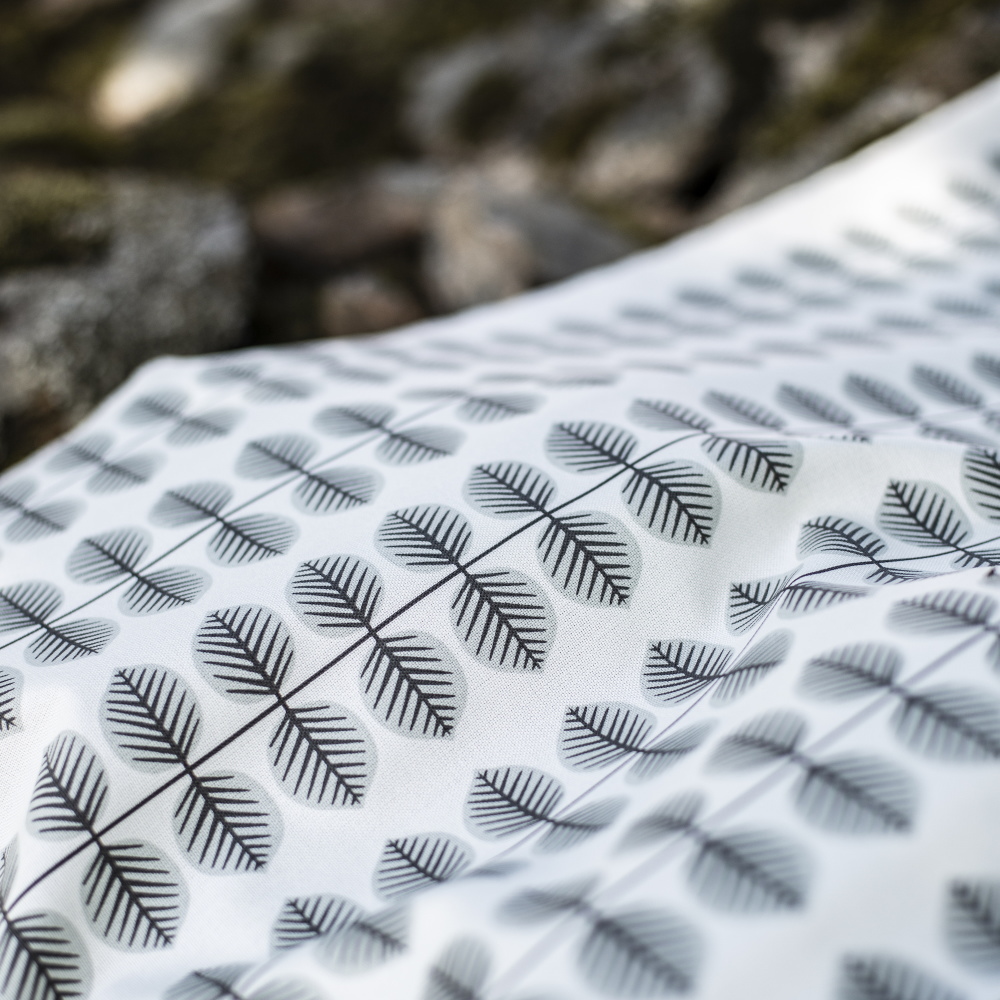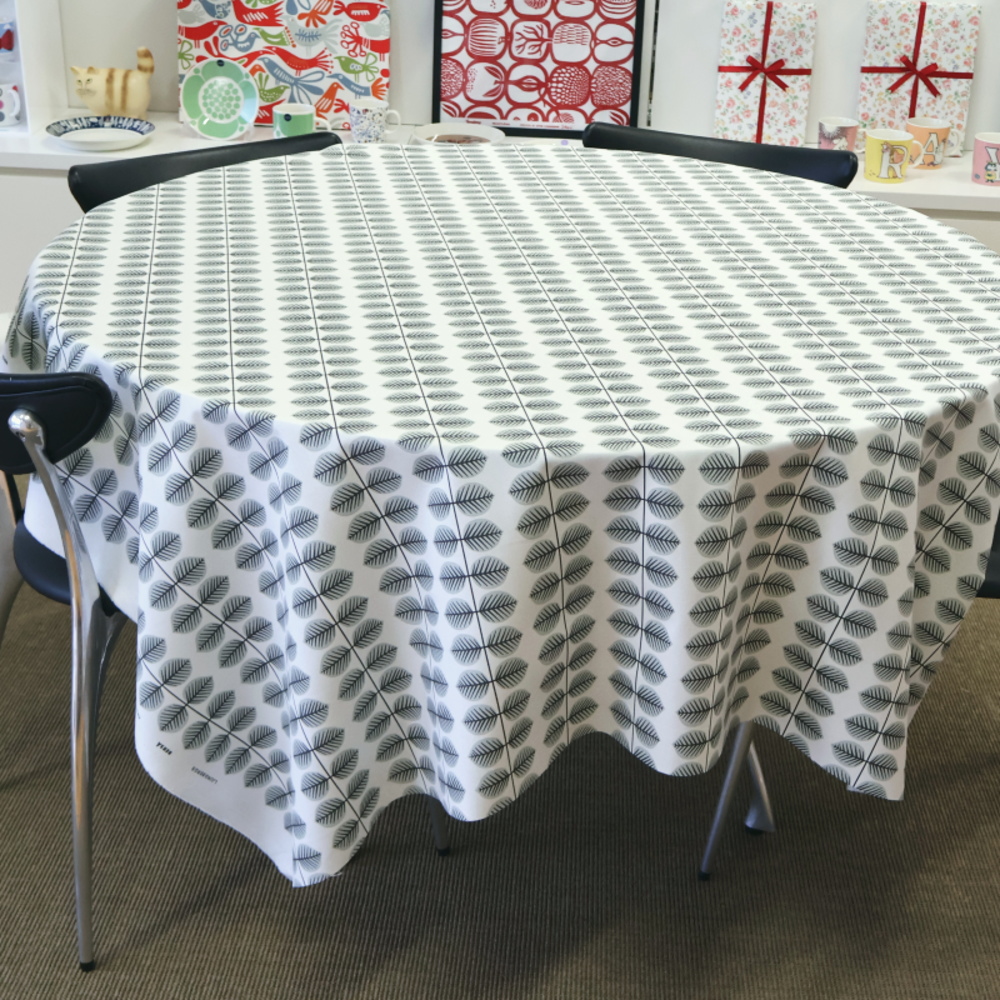 デザイナーはスティグ・リンドベリ。規則正しく並ぶリーフモチーフが印象的で、ホワイト×グレーの落ち着いた配色は、テーブルクロスやカーテン、クッションカバーなど幅広いアイテムに取り入れやすいデザインです。北欧らしいすっきりとした空間づくりにおすすめです。