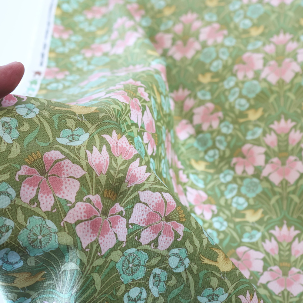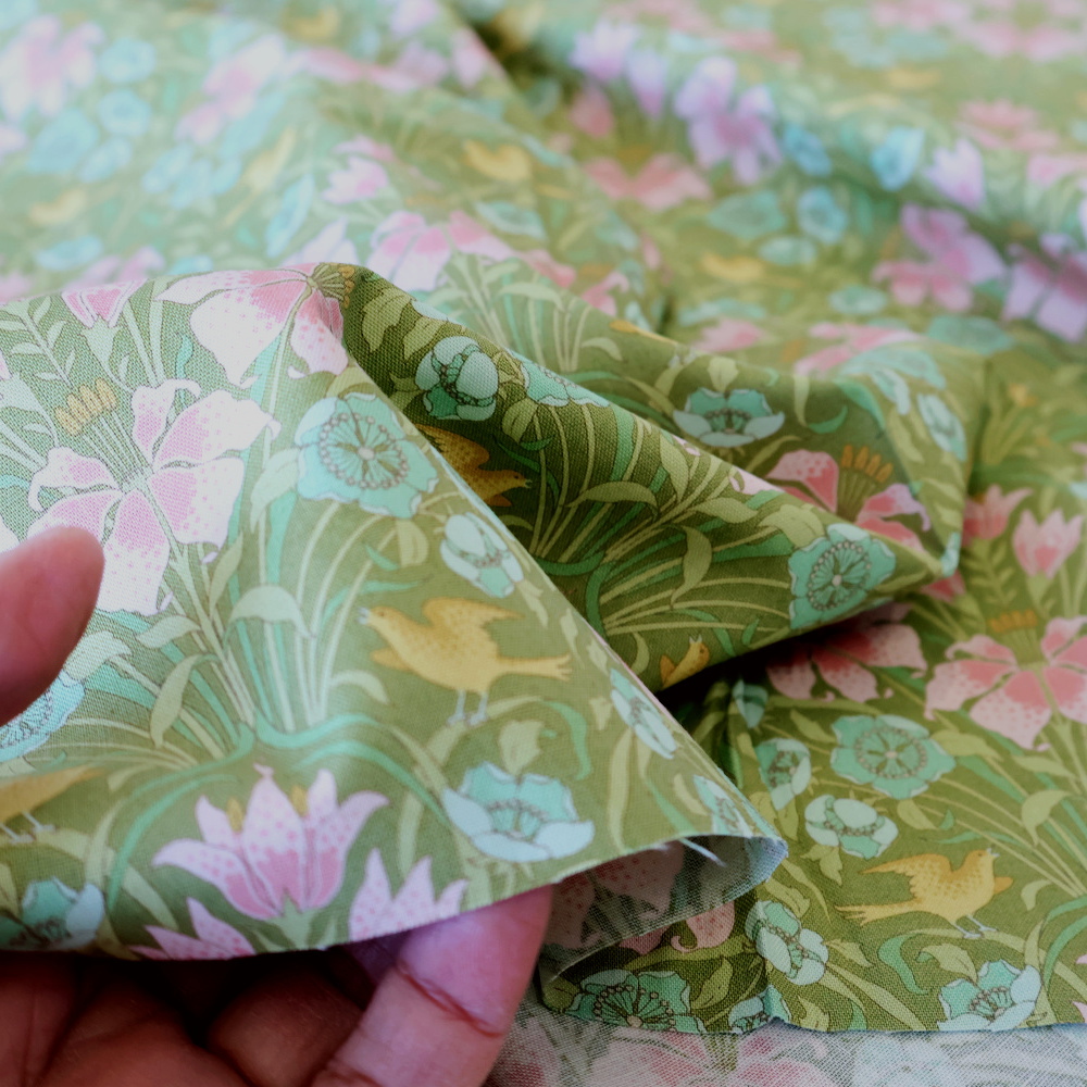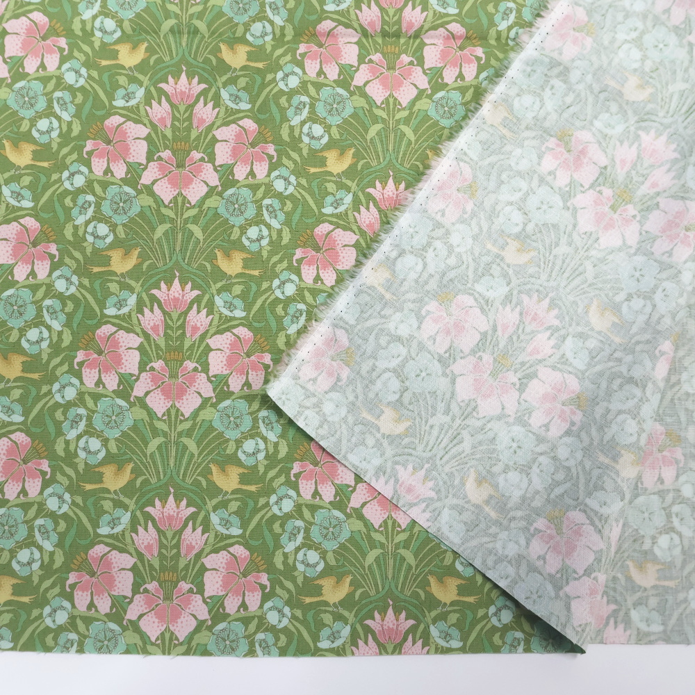 やわらかなオリーブグリーン地に、ピンクの花と淡いブルーの小花、小鳥のモチーフが描かれたクラシカルなデザイン。庭の風景を切り取ったような、物語性のあるファブリックです。甘さを抑えた落ち着いた色合いで、大人っぽい作品づくりにもおすすめです。