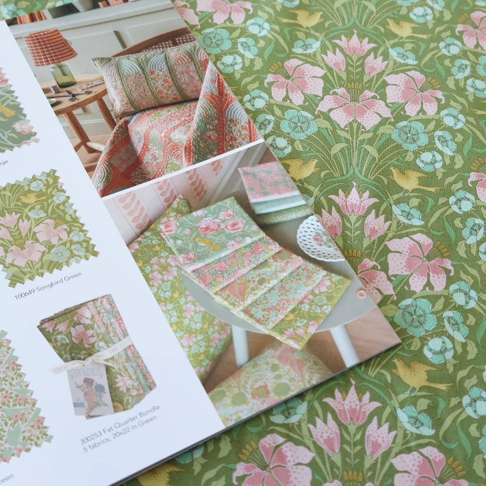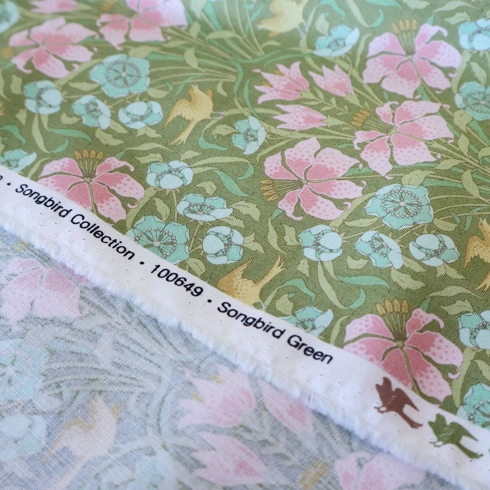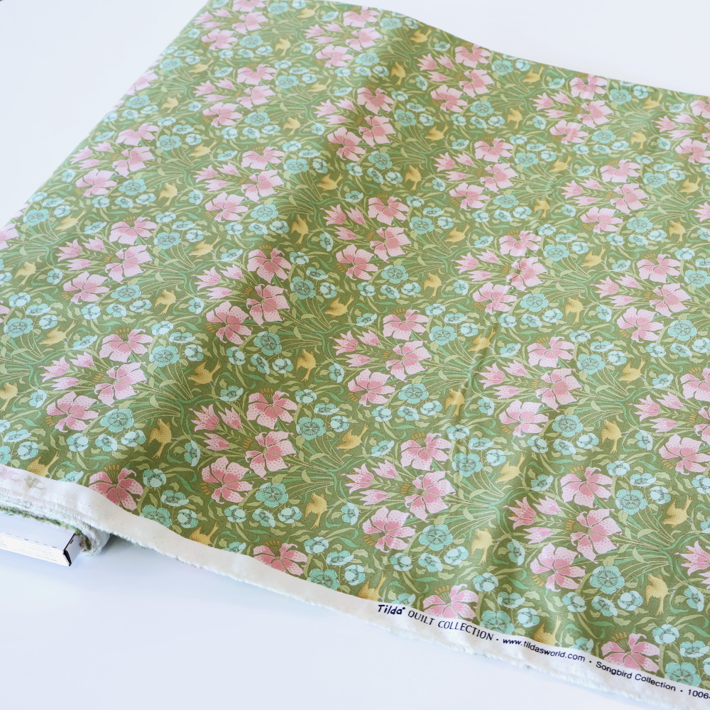 TildaのSongbirdコレクションから、Songbird Green(100649)。やわらかなオリーブグリーン地に、ピンクの花と淡いブルーの小花、そして小鳥が描かれたクラシカルなデザイン。庭の風景を思わせる、物語性のある一枚です。