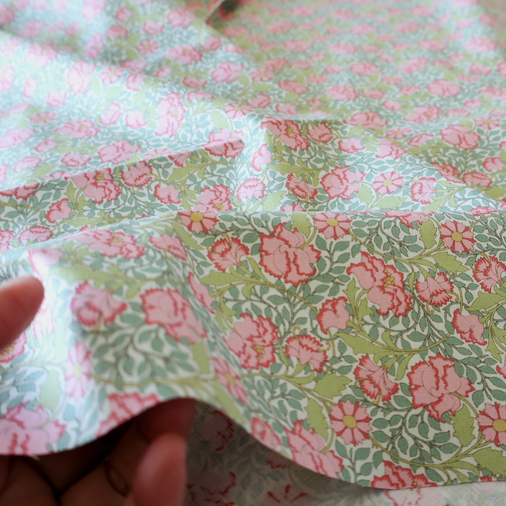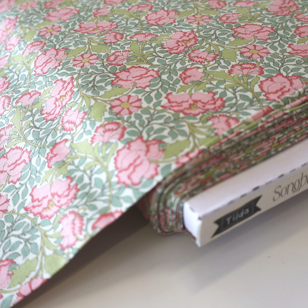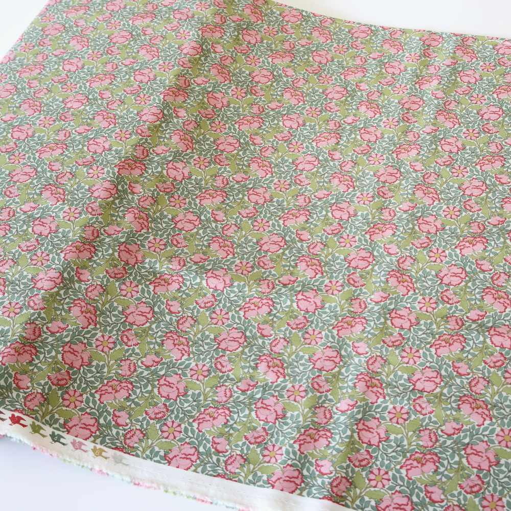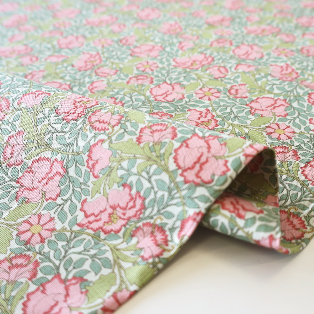 「Songbird」コレクションから、やわらかなセージグリーンの地に、ピンクの花と繊細なつる葉が広がるクラシカルなフローラルプリントです。アールヌーヴォーを思わせる流れるようなラインが美しく、甘さがありながらも落ち着いた印象にまとまっています。細かな総柄で、小物づくりからクッション、パッチワークまで幅広く使いやすいデザインです。