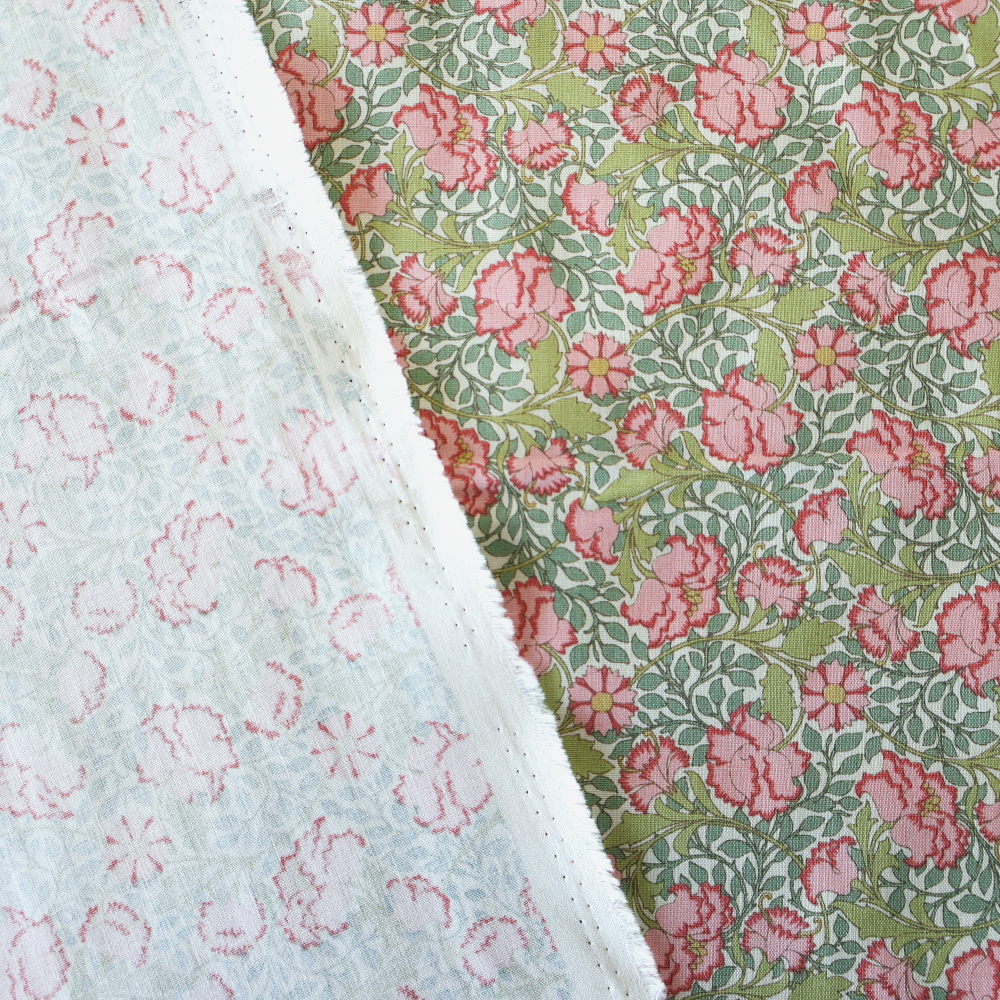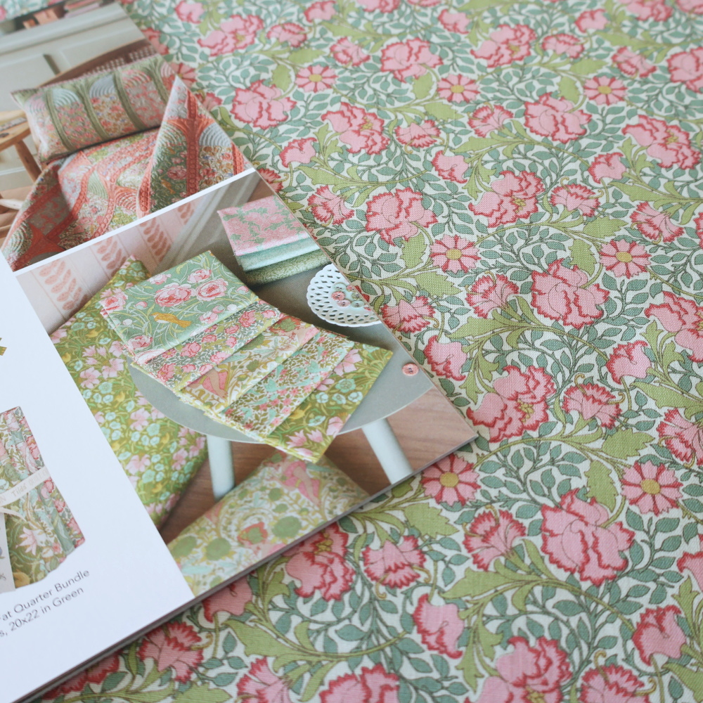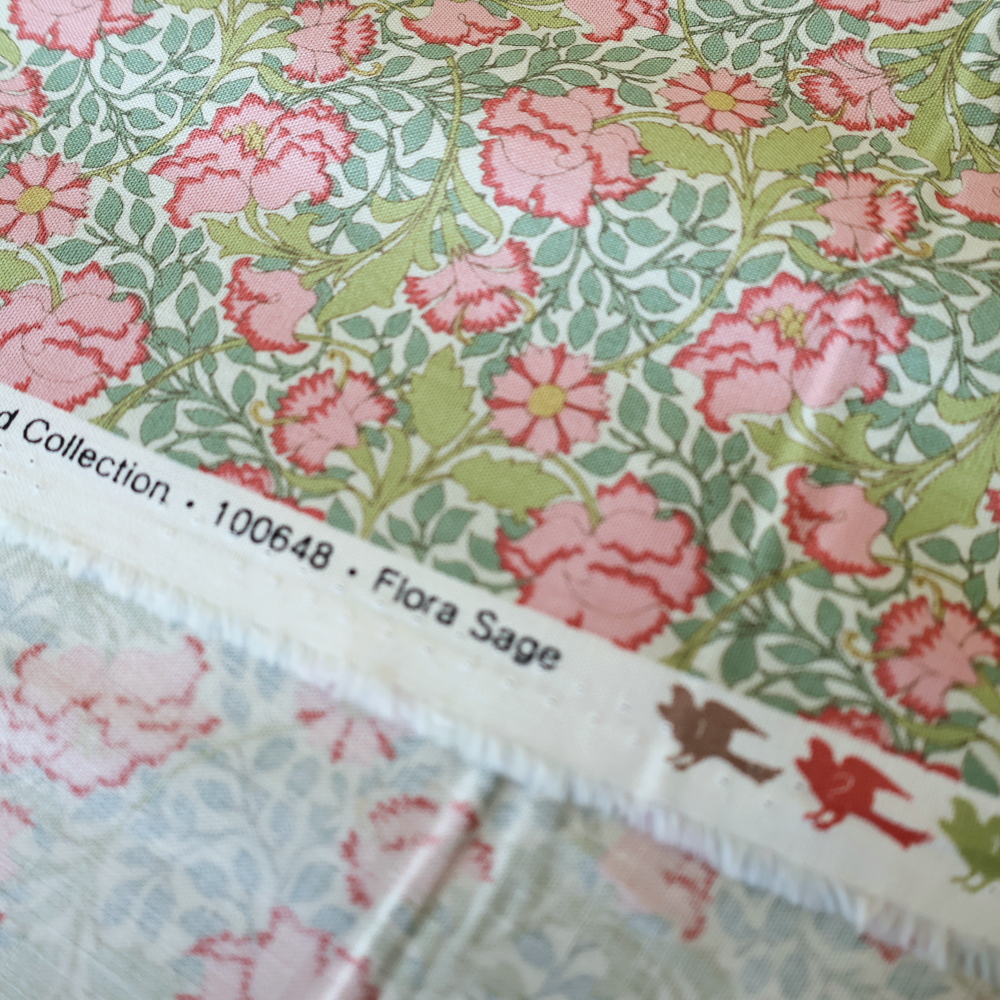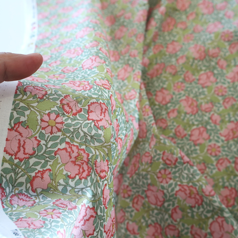 「Songbird」コレクションから、やわらかなセージグリーンの地に、ピンクの花と繊細なつる葉が広がるクラシカルなフローラルプリントです。アールヌーヴォーを思わせる流れるようなラインが美しく、甘さがありながらも落ち着いた印象にまとまっています。細かな総柄で、小物づくりからクッション、パッチワークまで幅広く使いやすいデザインです。